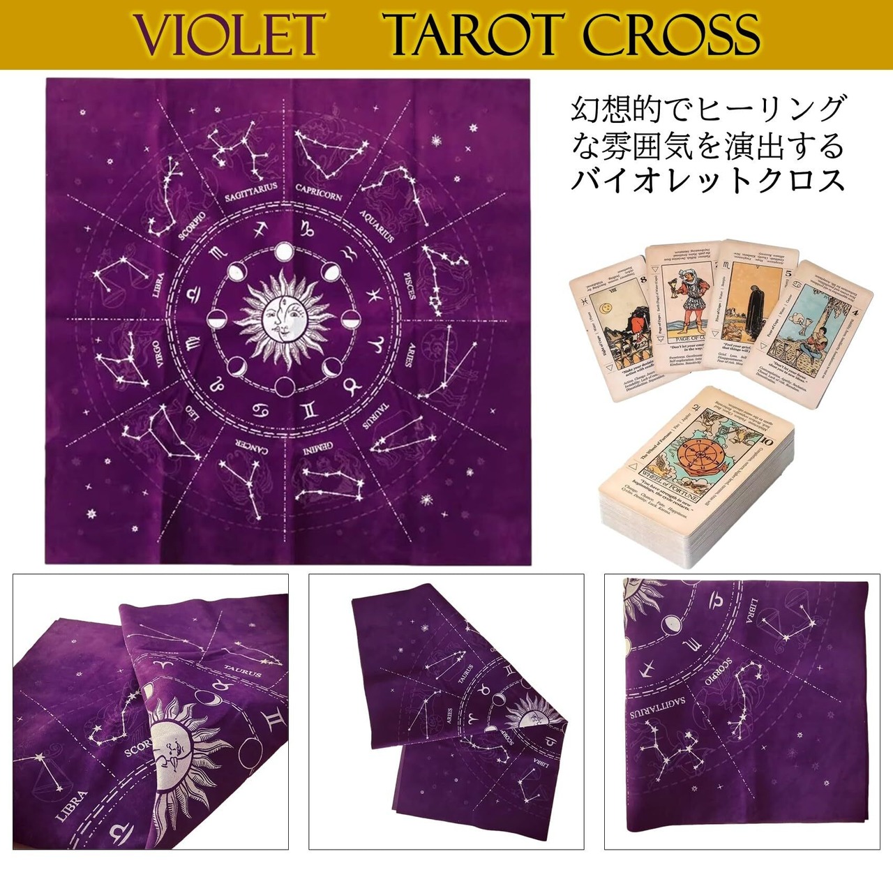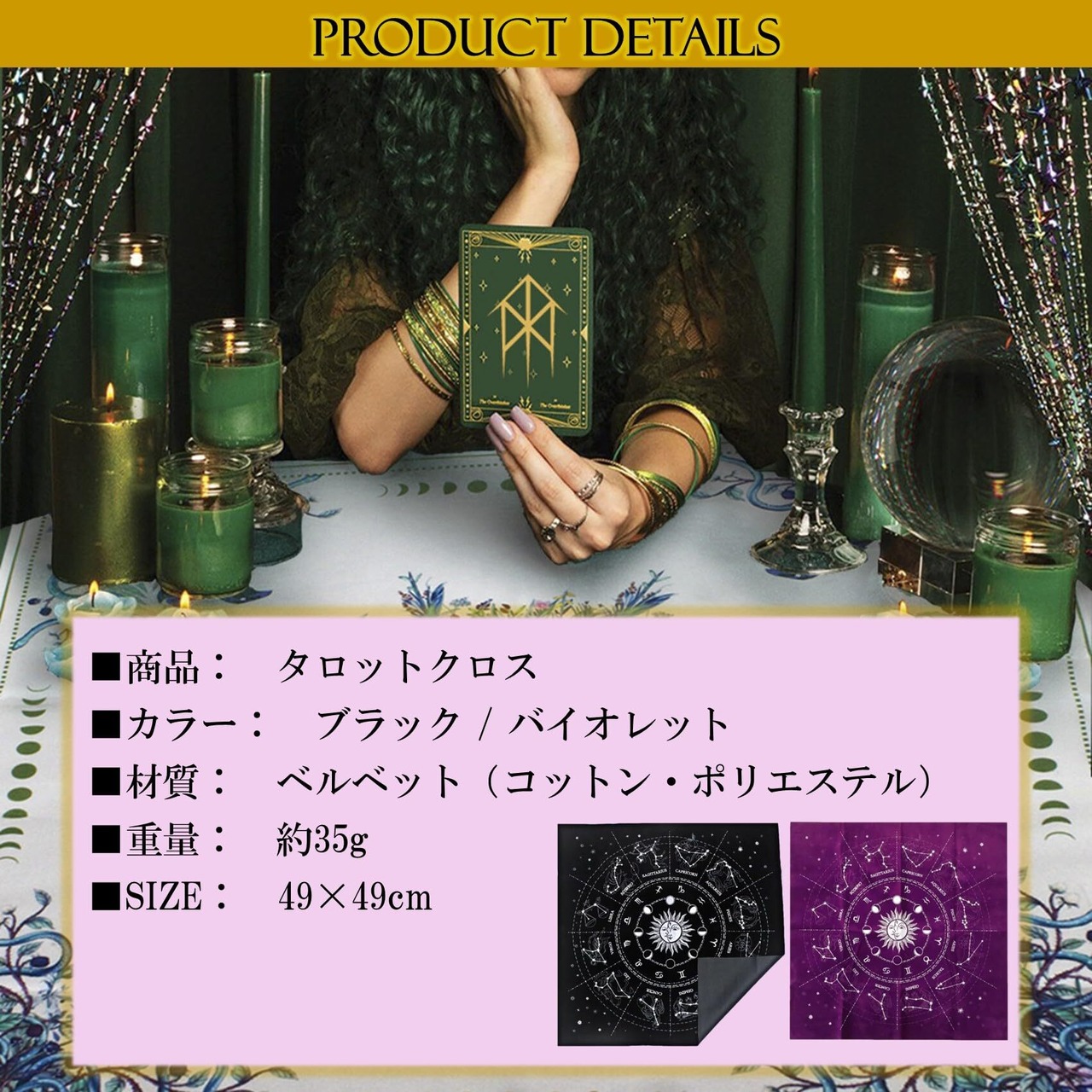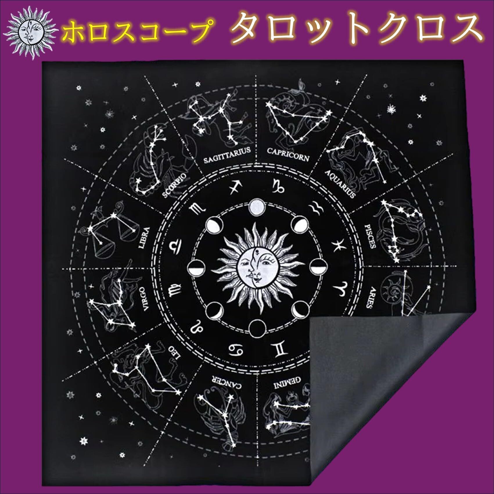 商品詳細:ホロスコープ柄タロットクロス 【カラー】 ブラック/バイオレット 【材質】 ベルベット(コットン・ポリエステル) 【重量】 約35g 【SIZE】 49×49cm