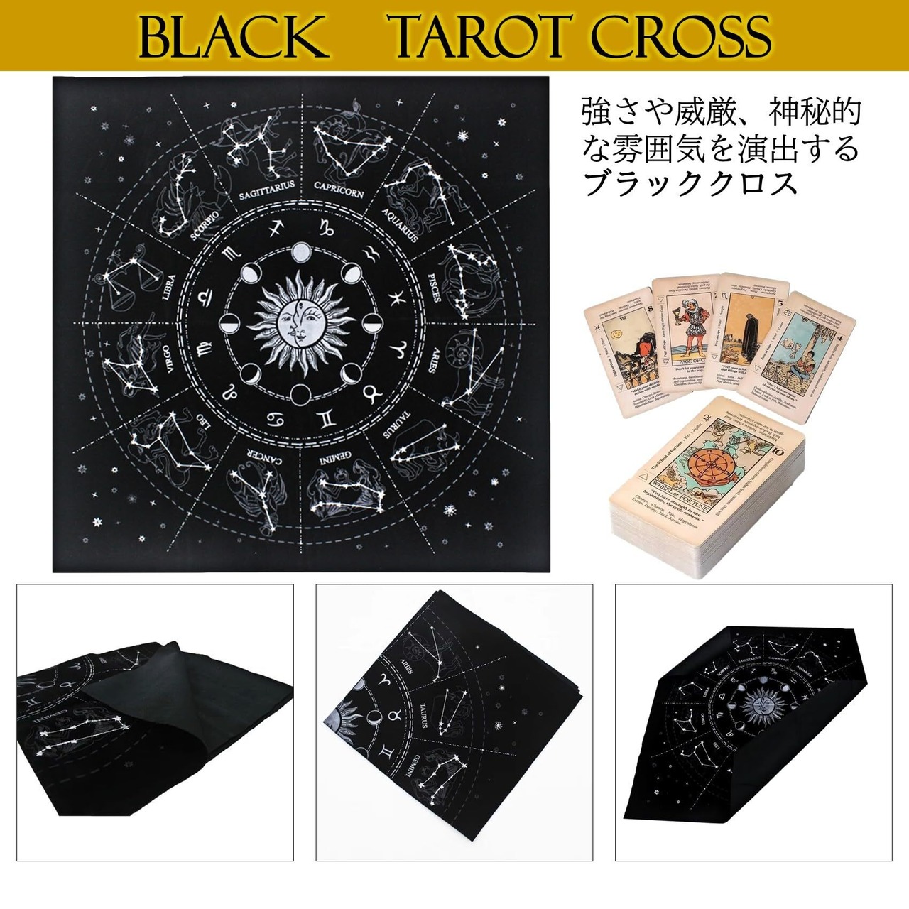 タロットクロスのサイズは正方形49×49cmです。材質は高級感のあるベルベット素材で、カードが程良く滑りやすく、シャッフルがしやすい素材です。また、タロットクロスを使用することでテーブルやタロットカードを傷や汚れから保護します。