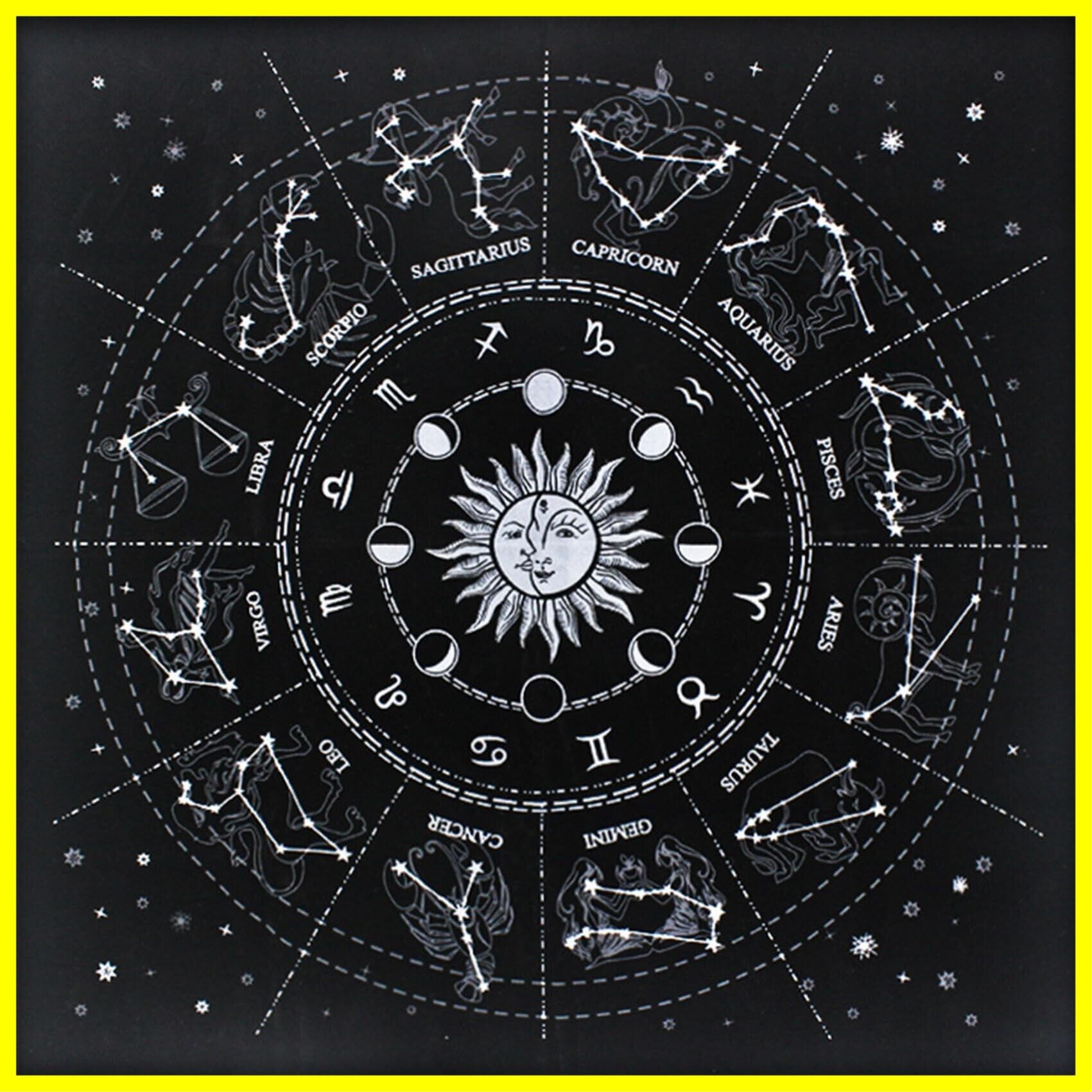 ベルベット素材、サイズ49×49cmタロットクロスです。ホロスコープ12星座をデザインした神聖で美しいタロットクロスは、タロットカードやオラクルカード占いの場を荘厳な雰囲気に演出します。テーブルクロスやウォールデコなどインテリアとしてもご愛用いただいているオシャレなタロットクロスです。
