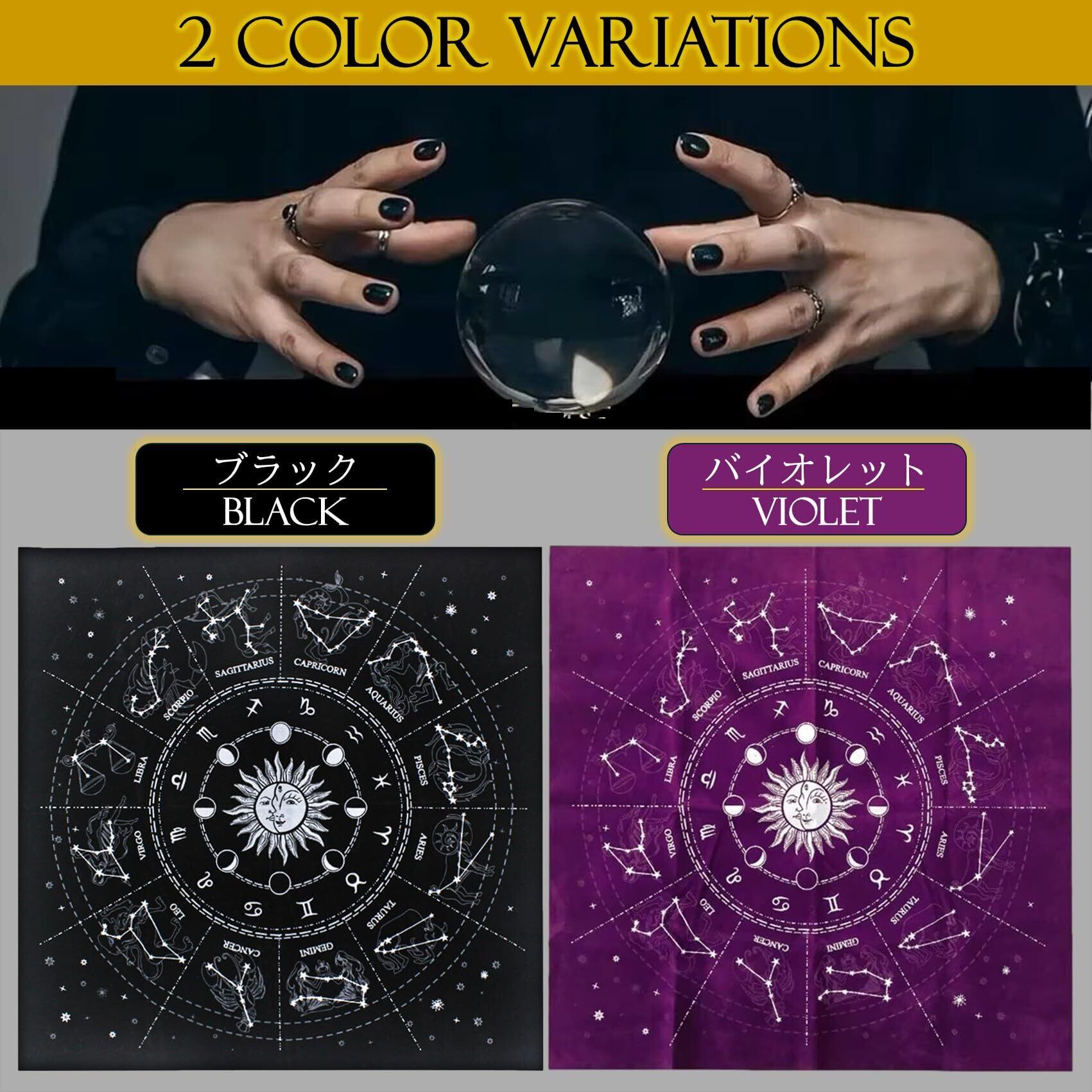 タロットクロスのカラーは、ブラック、バイオレットの2種類をご用意しました。ブラックは強さや威厳、神秘的な雰囲気を、バイオレットは幻想的でヒーリングな雰囲気を演出します。お好きな色、集中できる色、気分が落ち着く色、占いのシーンや目的などでカラーをお選びください。