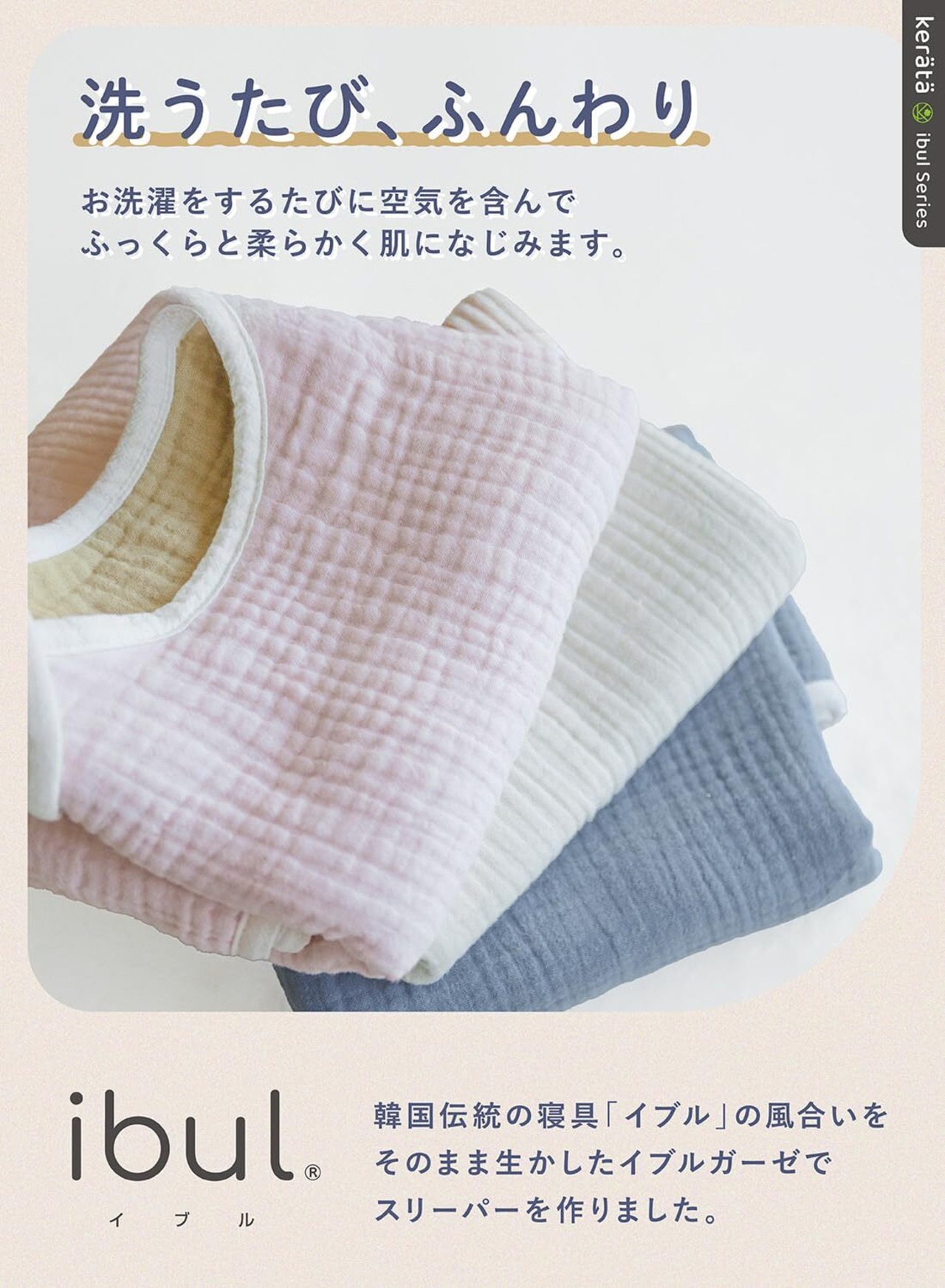 【イブルガーゼ】韓国発祥の寝具「イブル」をモチーフにデザインしたガーゼシーリーズ“ibul(イブル)”。イブルの優しい風合いを生かしたイブルガーゼでスリーパーを作りました。