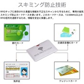 【磁気防止】電磁波や磁力、カード相互の干渉により磁気データ破損やスキミングなどの不正なカードデータの読み取りを防止します。また、RFIDブロッキングスリーブにカードを入れることによりICチップの汚れや摩耗による磁気不良を軽減することができます。