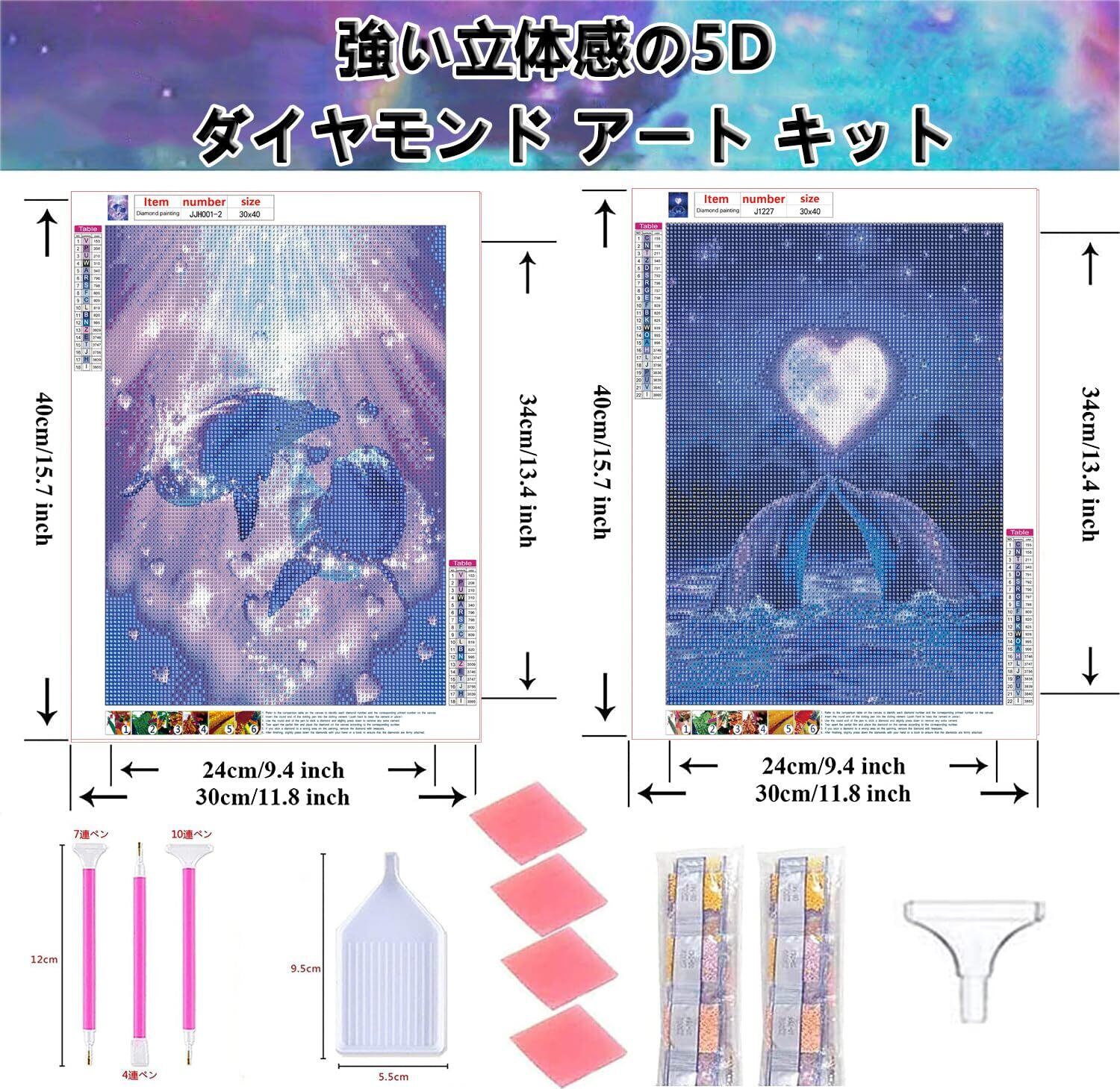 【ダイヤモンドアート キット内容】--2枚セットの5Dダイヤモンドアート、2枚のラベルステッカー、8個のグルー、6本のダイヤモンドペン、2個のビーズトレイ。(ダイヤモンドビーズの不足を避けるために、ビーズの数を30%増やしました。)本セットがあれば手軽にダイヤモンドアートを始めれます。