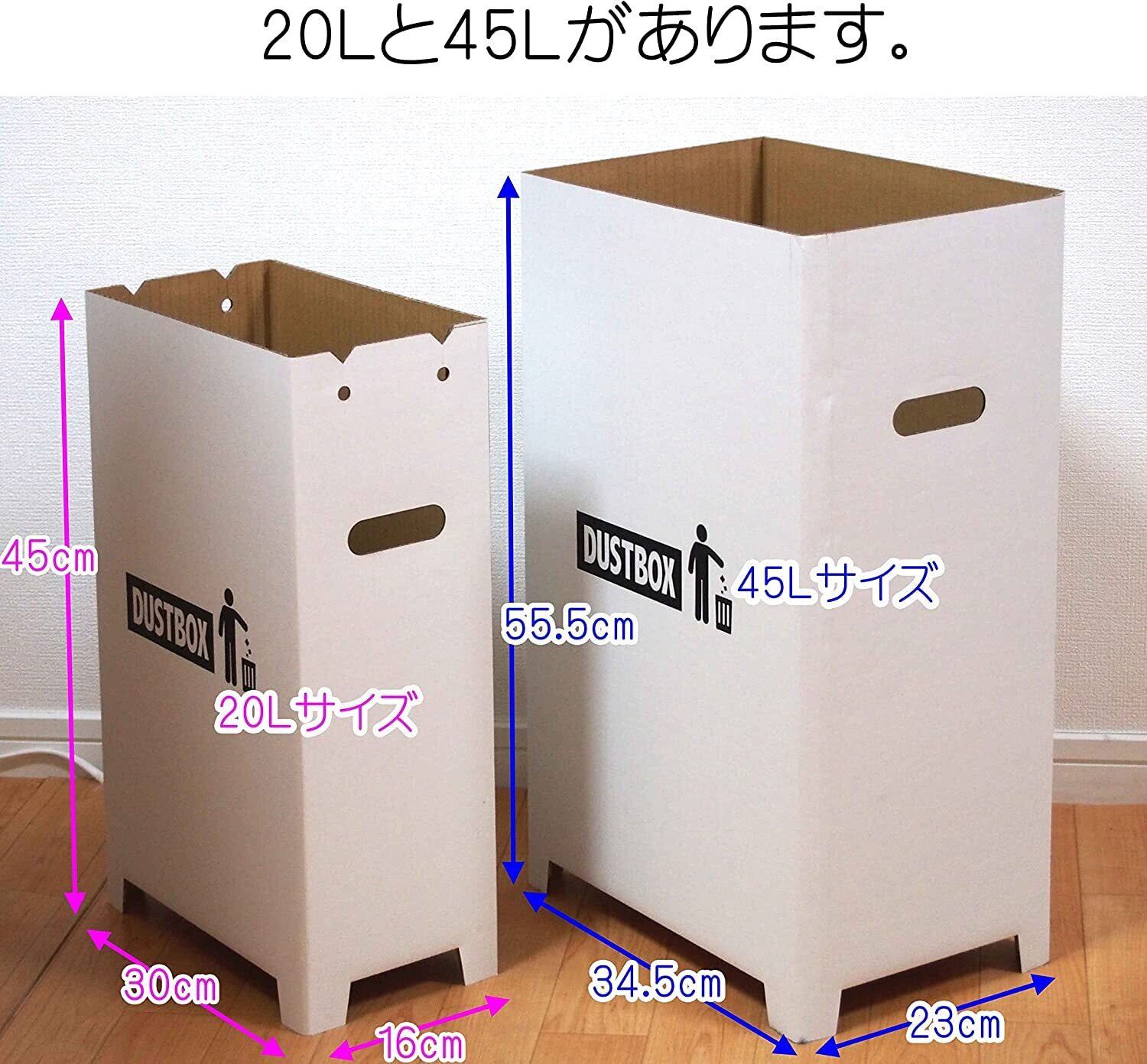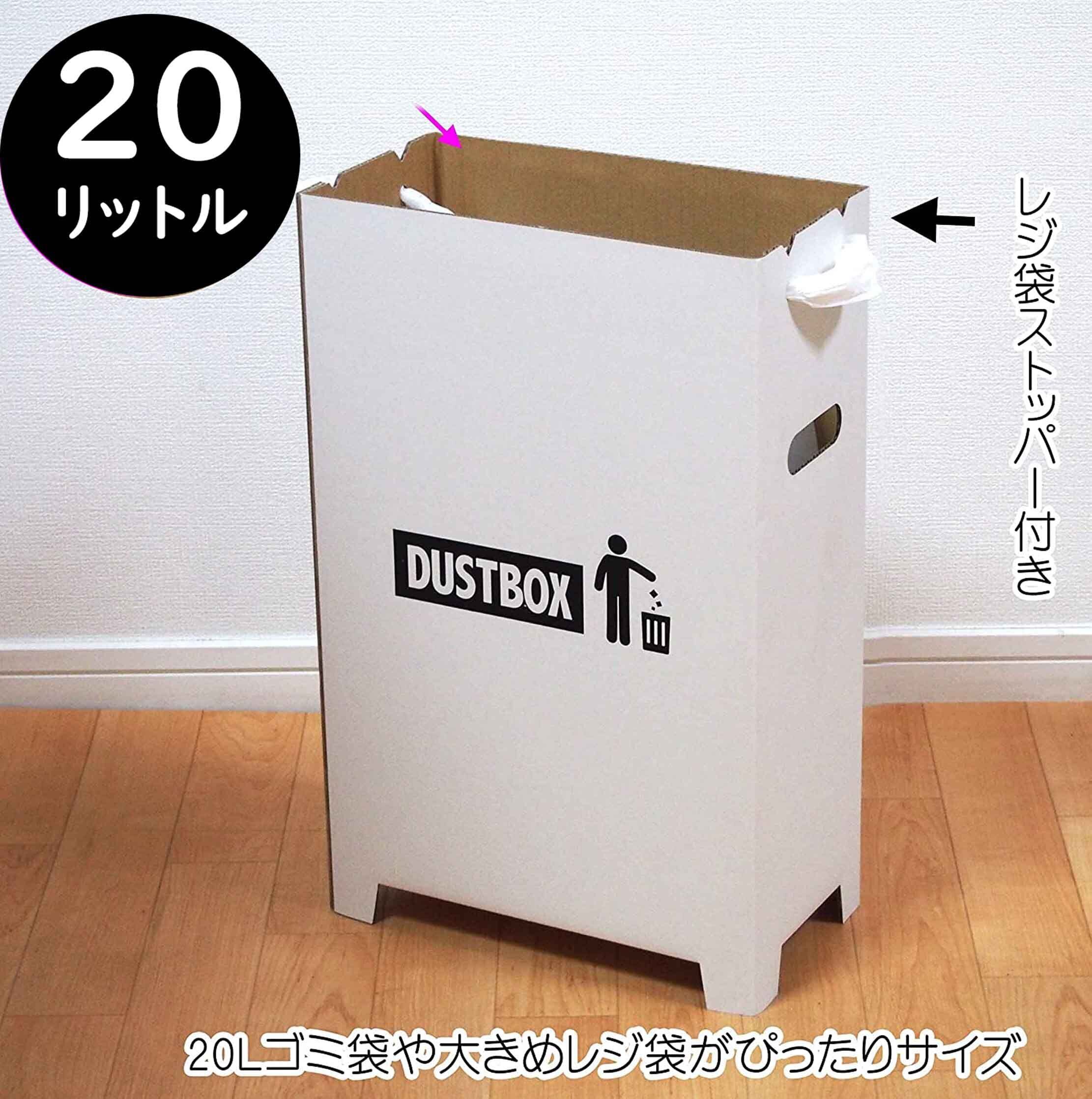 20リットル容量。スリムタイプのダンボール分別ダストボックス5個セット。組立て簡単、撥水加工で水に強くよれにくい。ビニールなしでそのまま使うこともできる仕様です。汚れに強いのも嬉しい。LLサイズのレジ袋がちょうどよいサイズです。釣り手を引っ掛けるスリット付きが便利。