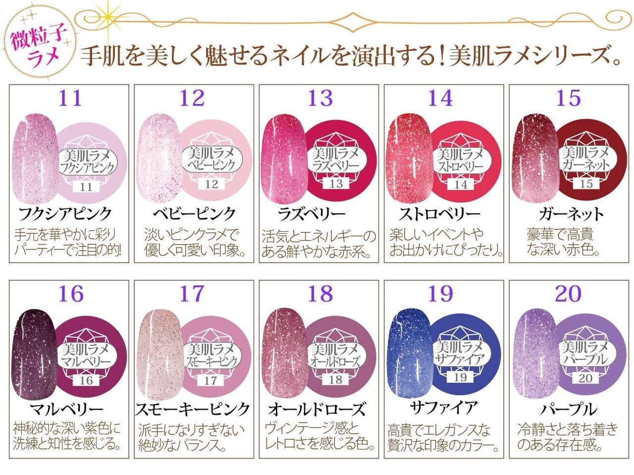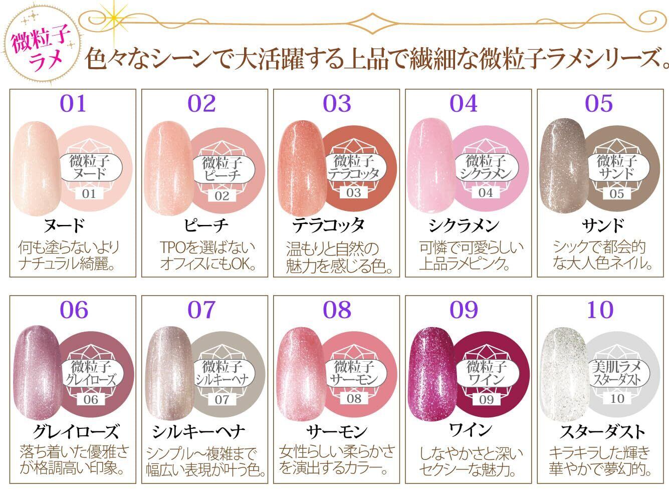 LED/UVライトどちらにも対応したアセトンで落とせるソークオフタイプのカラージェルです。 驚くほどの発色の良さはプロのネイリストさんも納得!お花のように可愛くてしっかり発色するプロユースの品質。 トレンド感のあるお洒落なバリエーションで色々なシーンでのネイルデザインをお楽しみ頂けます。 【硬化時間目安】 LEDライト → 30秒~90秒 UV-LEDライト → 30秒~60秒 UV&CCFLライト → 60秒~120秒 硬化波長数 : 395nm~405nm 化粧品登録済 【お読みください】 ・小さなお子様の手の届かないところでご使用、保管ください。 ・本製品をご使用中に身体に異常が現れた場合は、すぐにご使用を中止し医師にご相談ください。 ・皮膚が敏感な方、皮膚が紫外線に弱い方、アレルギー体質の方は本製品をご使用いただけません。 ・仕様が予告なく変更になる可能性がございます。 ・ご使用のモニターにより実際の色味と異なって見える場合があります。 【ご注意】 ※商品の性質上、開封、一度ご使用頂いた場合の返品・返金・交換はお受けできません。 重要なお知らせ ご注意(免責)> 必ずお読み下さい ・小さなお子様の手の届かないところでご使用、保管ください。 ・大変危険ですので、LEDライトの光は絶対に直視はしないで下さい。 ・本製品をご使用中に身体に異常が現れた場合は、すぐにご使用を中止し医師にご相談ください。 ・皮膚が敏感な方、皮膚が紫外線に弱い方、アレルギー体質の方は本製品をご使用いただけません。 ・仕様が予告なく変更になる可能性がございます。 ・ご使用のモニターにより実際の色味と異なって見える場合があります。※商品の性質上、開封、一度ご使用頂いた場合の返品・返金・交換はお受けできません。