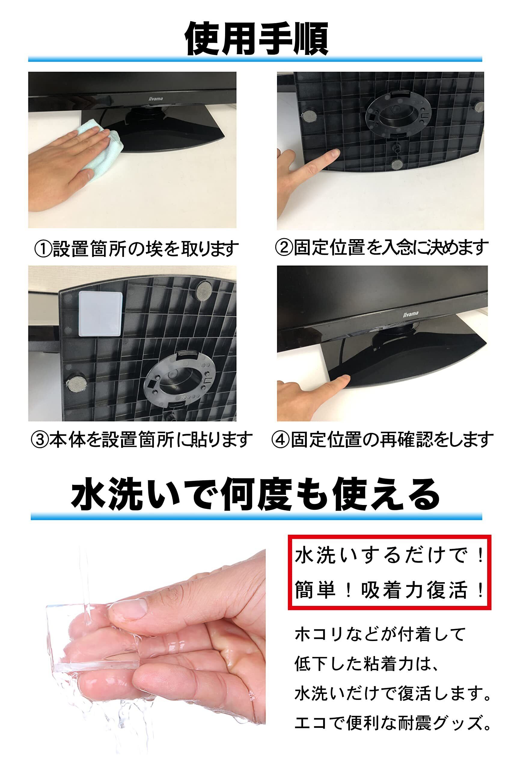【耐震力No1】震度7対応で東日本大震災クラスの大地震にも対応。4枚以上の設置で耐荷重100kgでトップクラスの耐震力を持つことが可能です。耐震力に重視をして安価なゴム素材を使わずに高品質で厚さ5mm の極厚耐震ジェルで地震から守ります。 4個/8個/12個/20個がご選択可能です。カラー:透明/ブルー。8パターンから用途に合わせてご自由に選んでいただくことが可能です。手軽にご使用できます。
