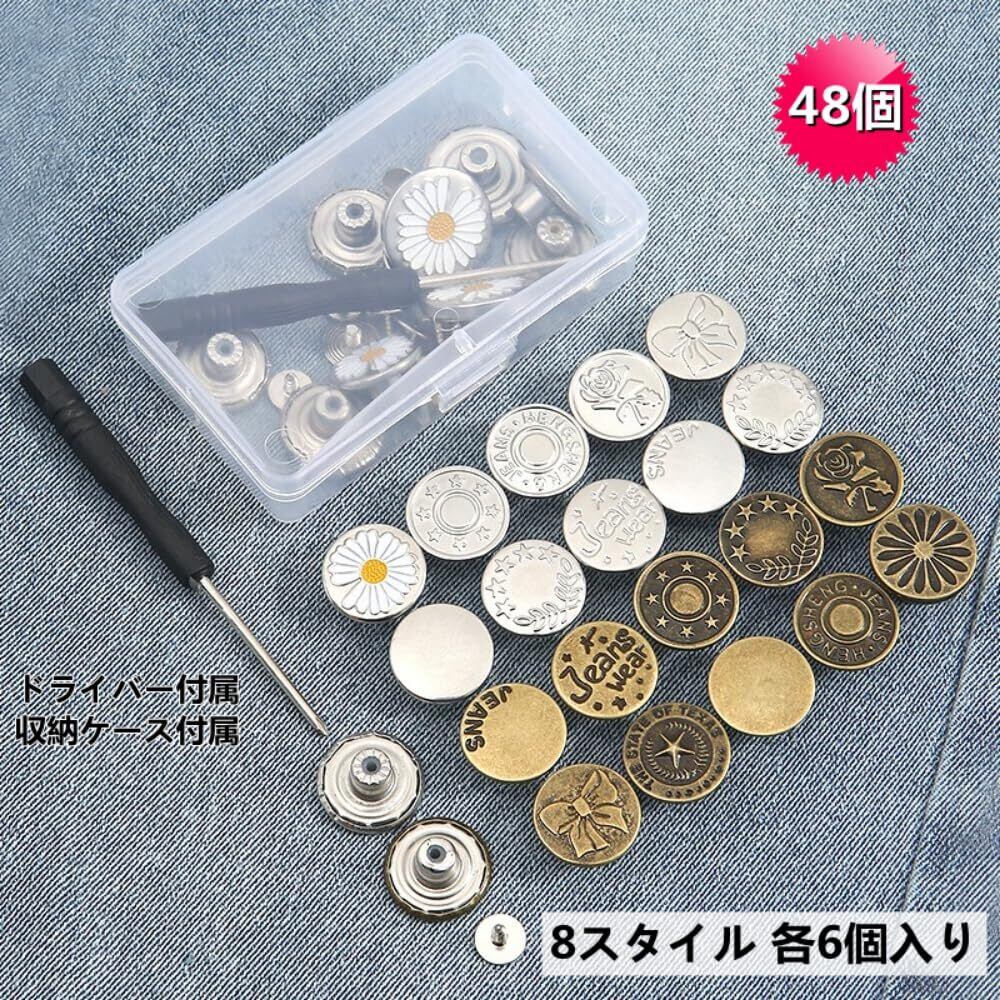 【商品仕様】直径17mm,ジーンズボタン×48個(8スタイル各6個入り)+専用ドライバー×1本。