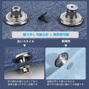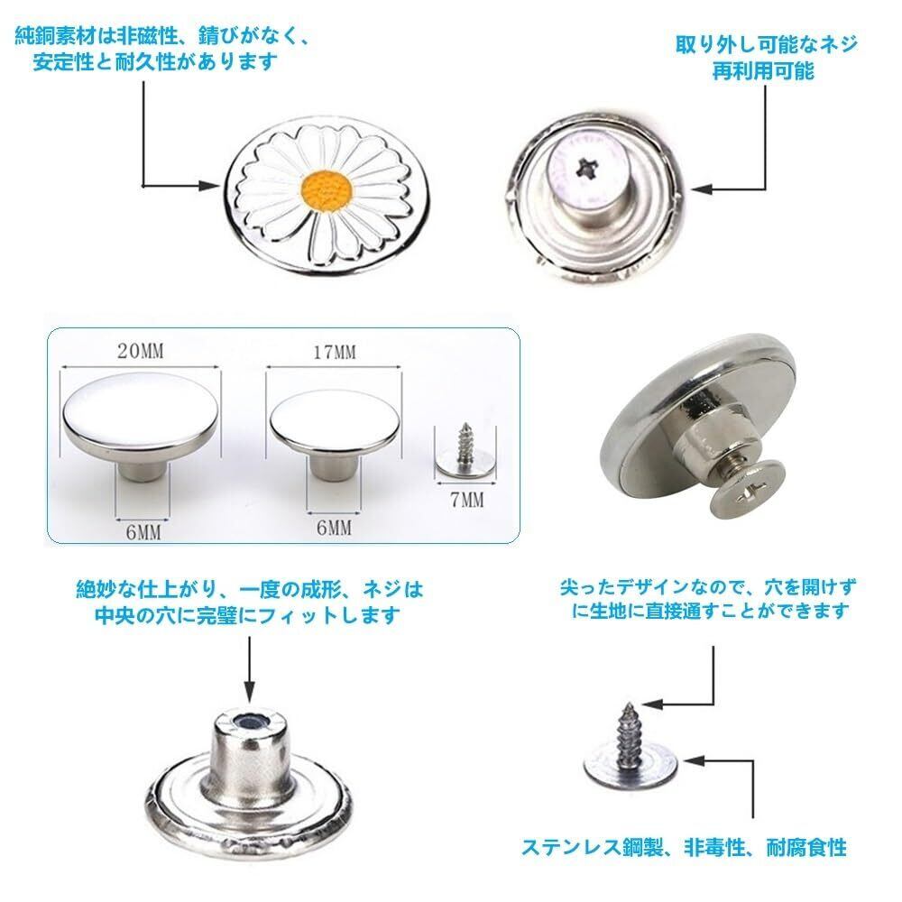 【製品特徴】ネジ先端のデザインにより、衣服を傷つけずに布地を通して簡単に取り付けることができます。ジーンズのボタンを交換する場合、裏側の留め具は細かく磨かれており、取り付けると平らになります。ジーンズのボタンを交換する場合、裏側のバックルは細かく磨かれており、取り付け後は平らになります。交換後はとても快適です。