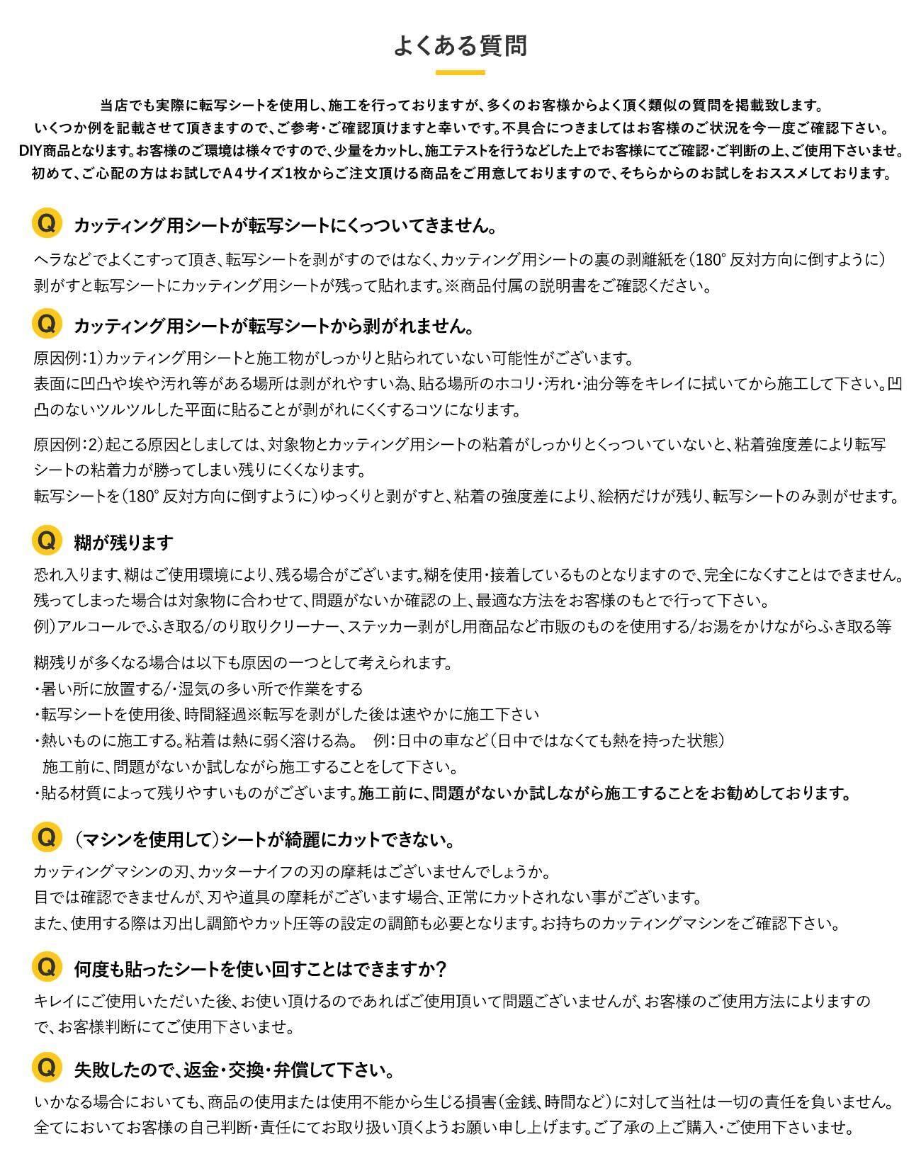 ●貼り付け時によるフィルムの破損(ゆがみ、汚れ、気泡等)及び貼りはがしの際に発生するキズ、破損等につきましては当社では一切の責任を負いかねます。予めご了承ください。●当店では、お求めやすい価格にてご提供させて頂くために、長大なロールから切り売り販売しております。その為どうしてもロールの伸縮によりロールのはじめと終わりのほうで粘着力が若干変化してしまう場合ございます。粘着力を統一したい場合などは、同時期(同カート)の購入をお勧めいたします。できる限り同ロールを使用しカット致します。●仕入れ時期により粘着力が若干異なる場合がございます。ご了承くださいませ。●直射日光などに含まれる紫外線による色あせ、積雪など使用場所、状況により劣化を早める場合がありますので、ご了承下さいませ。
