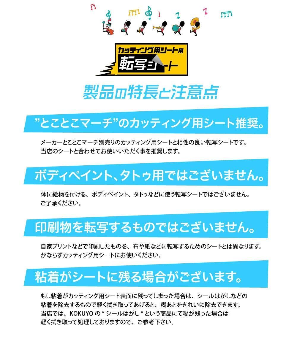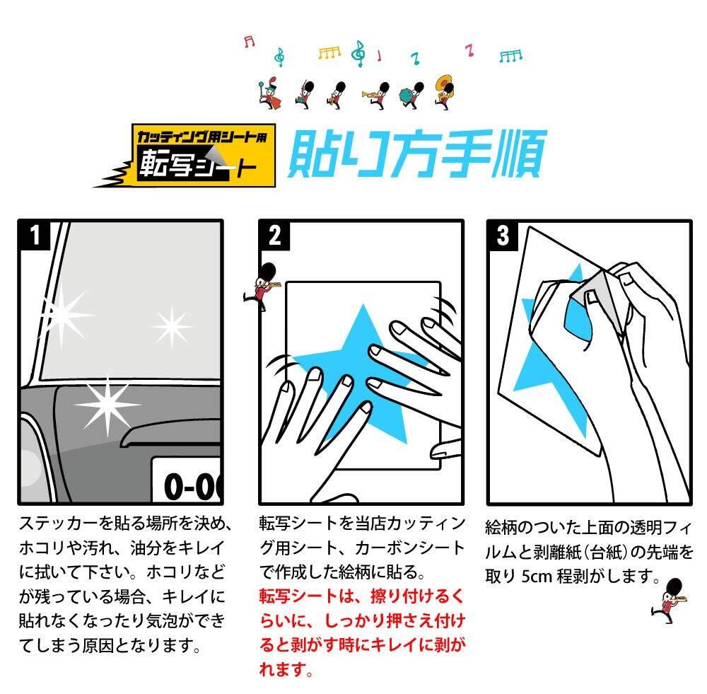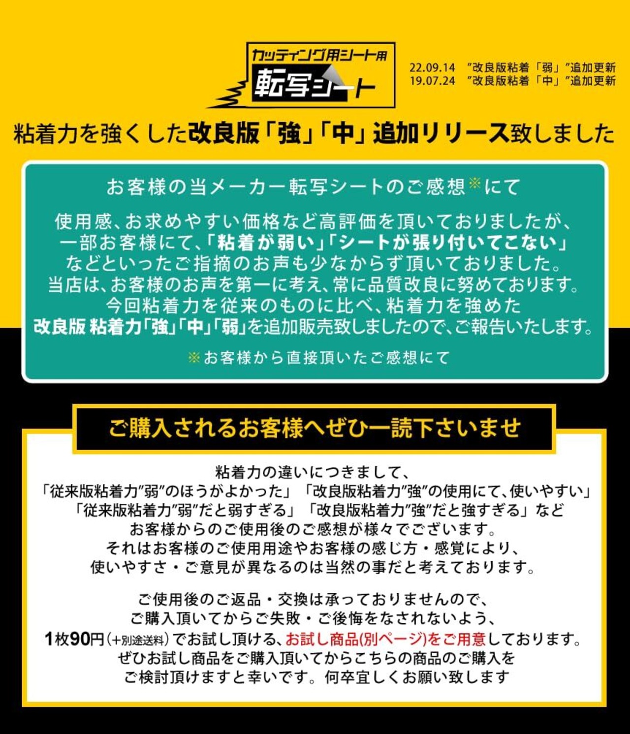 [よりお知らせ]粘着力の違いにつきまして、「従来版粘着力”弱”のほうがよかった」「改良版粘着力”強”の使用にて、使いやすい」「従来版粘着力”弱”だと弱すぎる」「改良版粘着力”強”だと強すぎる」などお客様からのご使用後のご感想が様々でございます。ご使用用途やお客様の感覚により、使いやすさ・ご意見が異なっております。ご使用後のご返品・交換は承っておりませんので、ご失敗なされないよう、A4サイズ1枚のお試し商品をご用意しております。ぜひお試し商品を試して頂いてから商品のご購入をご検討頂けますと幸いです。 【サイズがぴったりA4サイズではございません。約20cm×約30cmとなります】オリジナルステッカーが簡単に作れる、カッティング用シートとこの転写フィルムさえあれば、ステッカーが自由に作れる。素材が薄いため、細かい文字や曲面がある図も作業がしやすいのが特徴です。 市販のカッティングマシン・カッティングブロッターを使用することができます。 切り取ったカッティング用シートなどに、この転写フィルム(アプリケーションフィルム)を全体に貼り、カッティング用シートと一緒に剥がして、貼りたい箇所に貼って、あとは、転写シートだけを剥がして完成 使用例: スキースノーボード、サーフィンなどのアウトドア用品 バイク・カー用オリジナルステッカー コンサート用うちわ スーツケースの目印に 店舗などショーウィンドーにも●ステッカーをはがした際に、日焼けあと、のり残りが生じる場合がありますが、当社では一切の責任を負いかねます。予めご了承ください。●貼り付け時によるフィルムの破損(ゆがみ、汚れ、気泡等)及び貼りはがしの際に発生するキズ、破損等につきましては当社では一切の責任を負いかねます。●当店では、お求めやすい価格にてご提供させて頂くために、長大なロールから切り売り販売しております。その為どうしてもロールの伸縮によりロールのはじめと終わりのほうで粘着力が若干変化してしまう場合ございます。粘着力を統一したい場合などは、同時期(同カート)の購入をお勧めいたします。できる限り同ロールを使用しカット致します。●仕入れ時期により粘着力が若干異なる場合がございます。ご了承くださいませ。