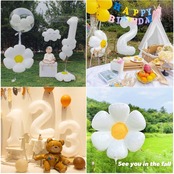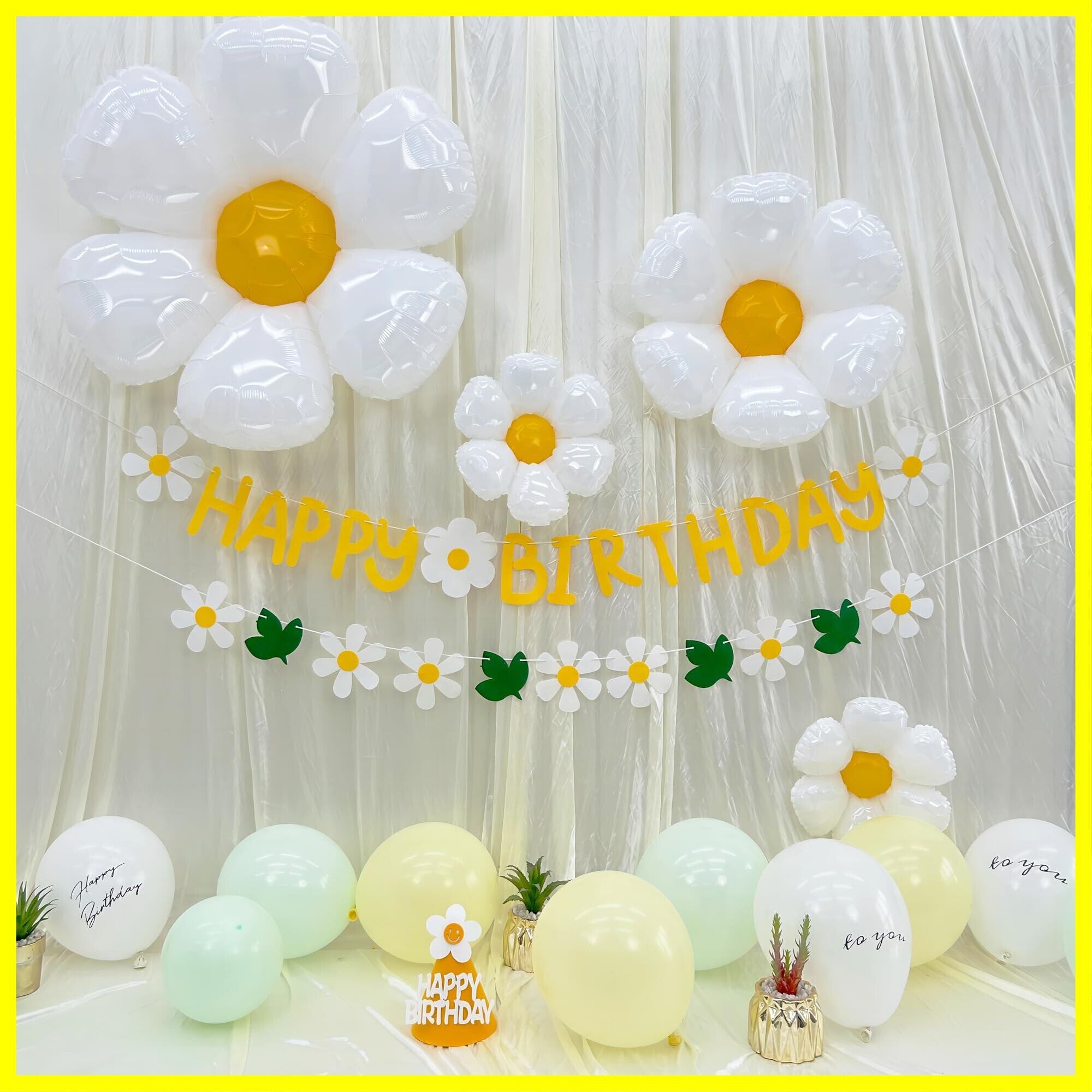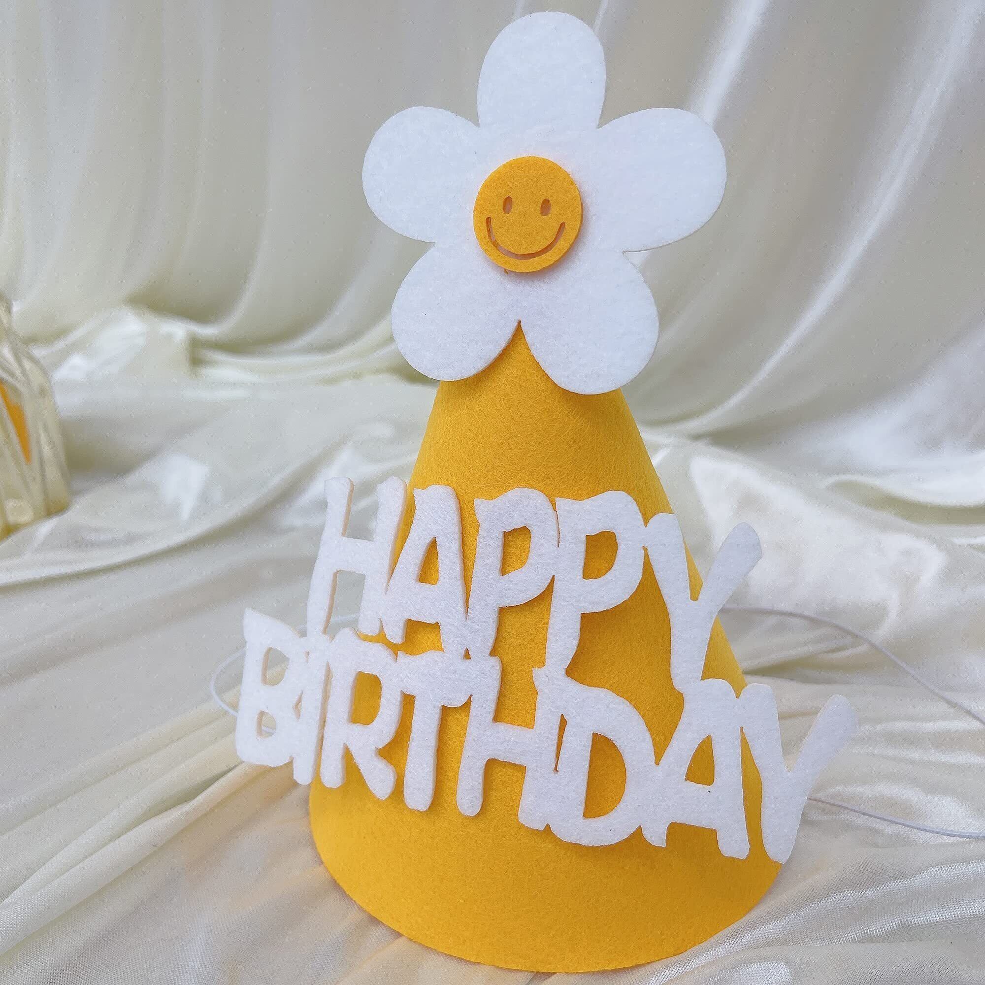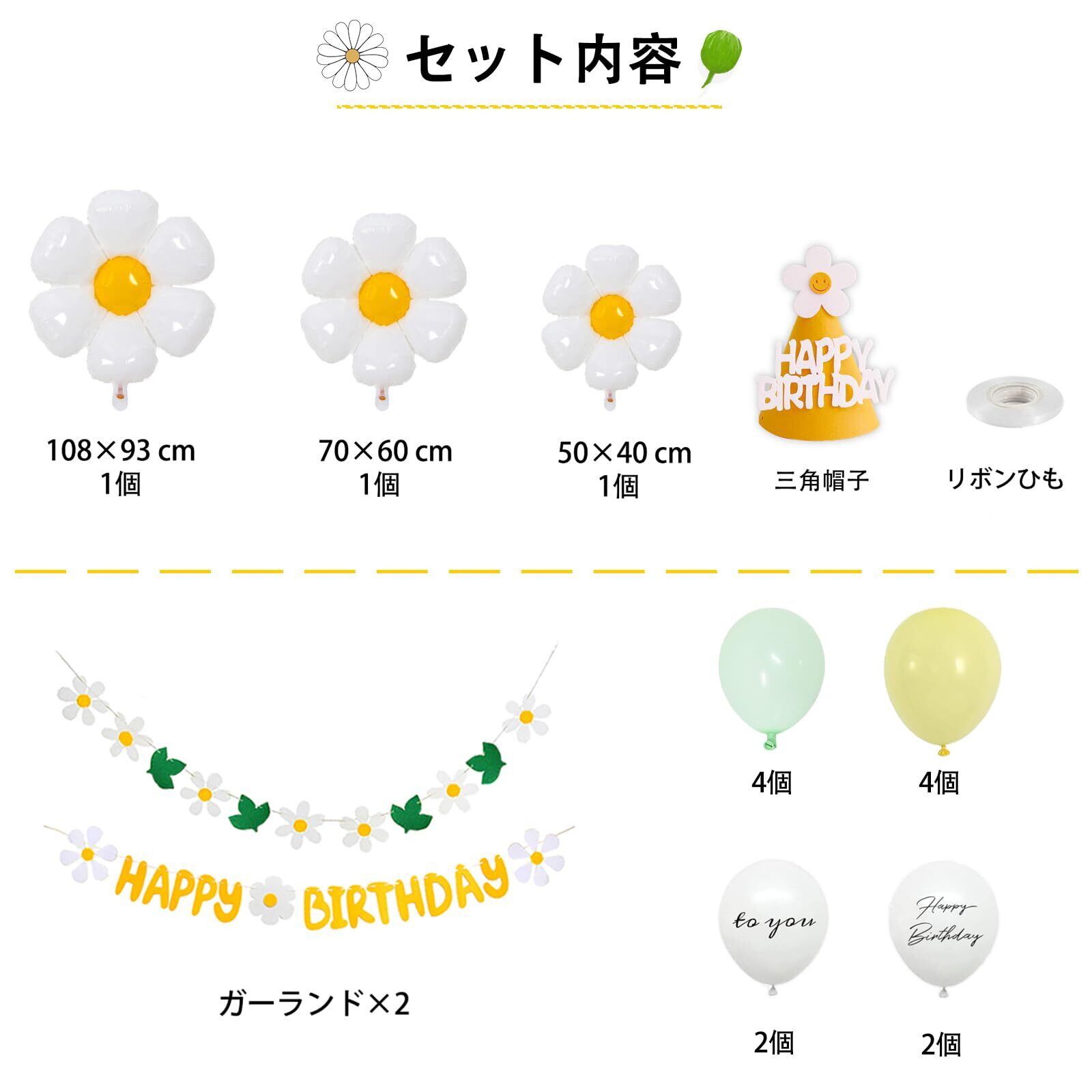 【セット内容】①フェルト布ガーランド×2 ②デイジーバルーン ×4 ③ゴム風船×12 (HAPPY BIRTHDAY × 2、TO YOU × 2、うすい黄色× 4、淡緑色× 4)④三角帽子×1 ⑤リボンひも (10m)