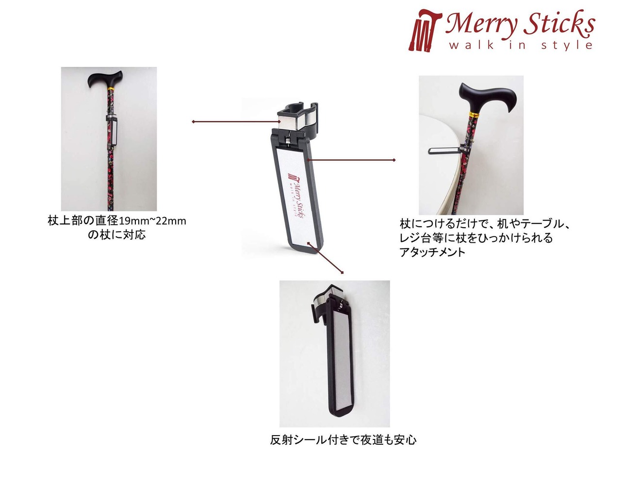 Merry Sticks(メリースティックス)/ ステッキクリップホルダー/杖ホルダー/転ばぬ杖/転倒防止/杖やすめ/杖立/杖掛け 倒れない/杖 フック/杖 ストッパー