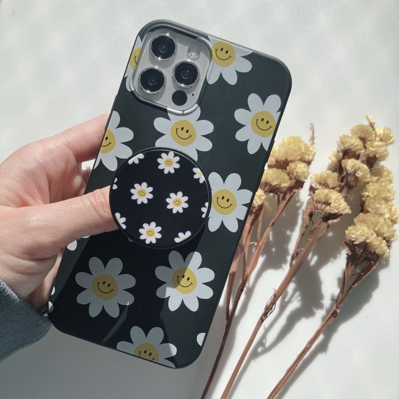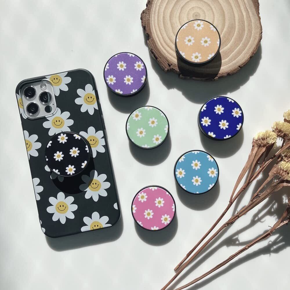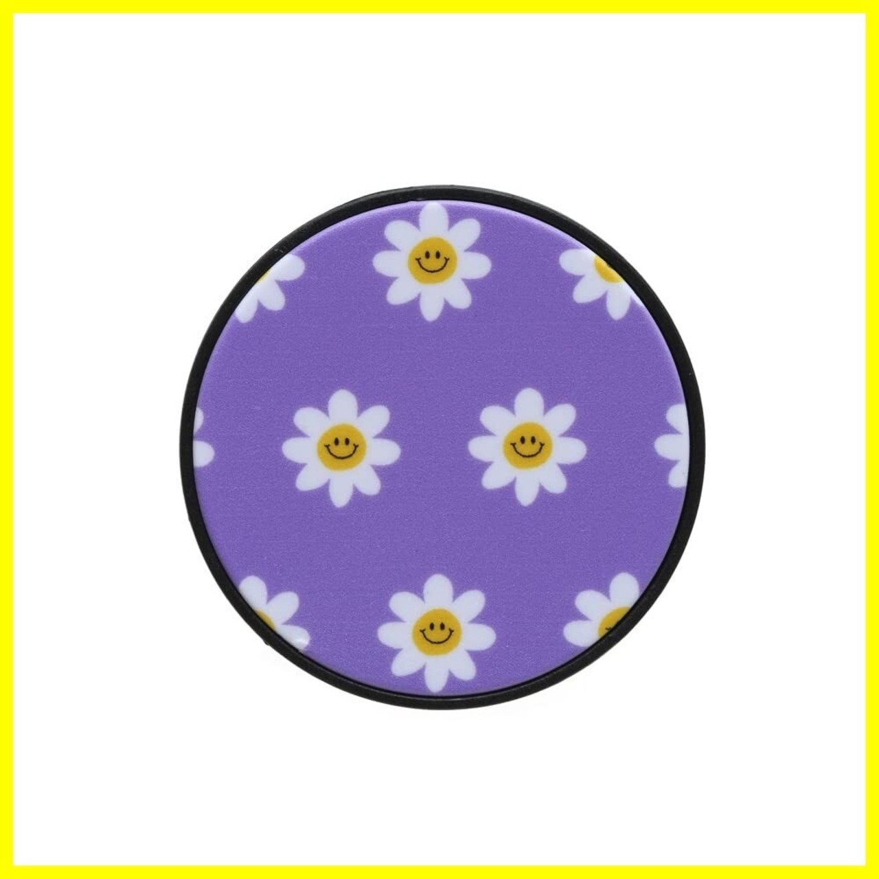 スマホグリップ 韓国 シンプル かわいい おしゃれ スマホスタンド 落下防止 デザイン サークル スマイル フラワー ニコちゃん お揃い(ブラック パープル)