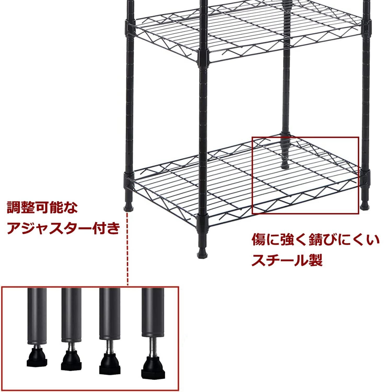 【高さ調節できる棚板】全5段の棚板で充実の収納力、スチールフレームでしっかりとした耐久力を持ち、キッチン周りをひとつにまとめて快適にお使いいただけます。ポールに入った2.5cm間隔の溝で棚板の高さが変えられるので、収納する物に合わせて、ムダなく最適なスペースで収納できます。