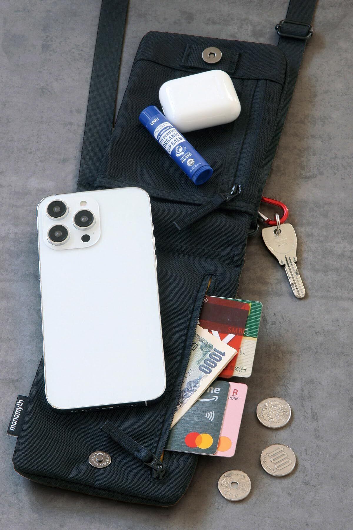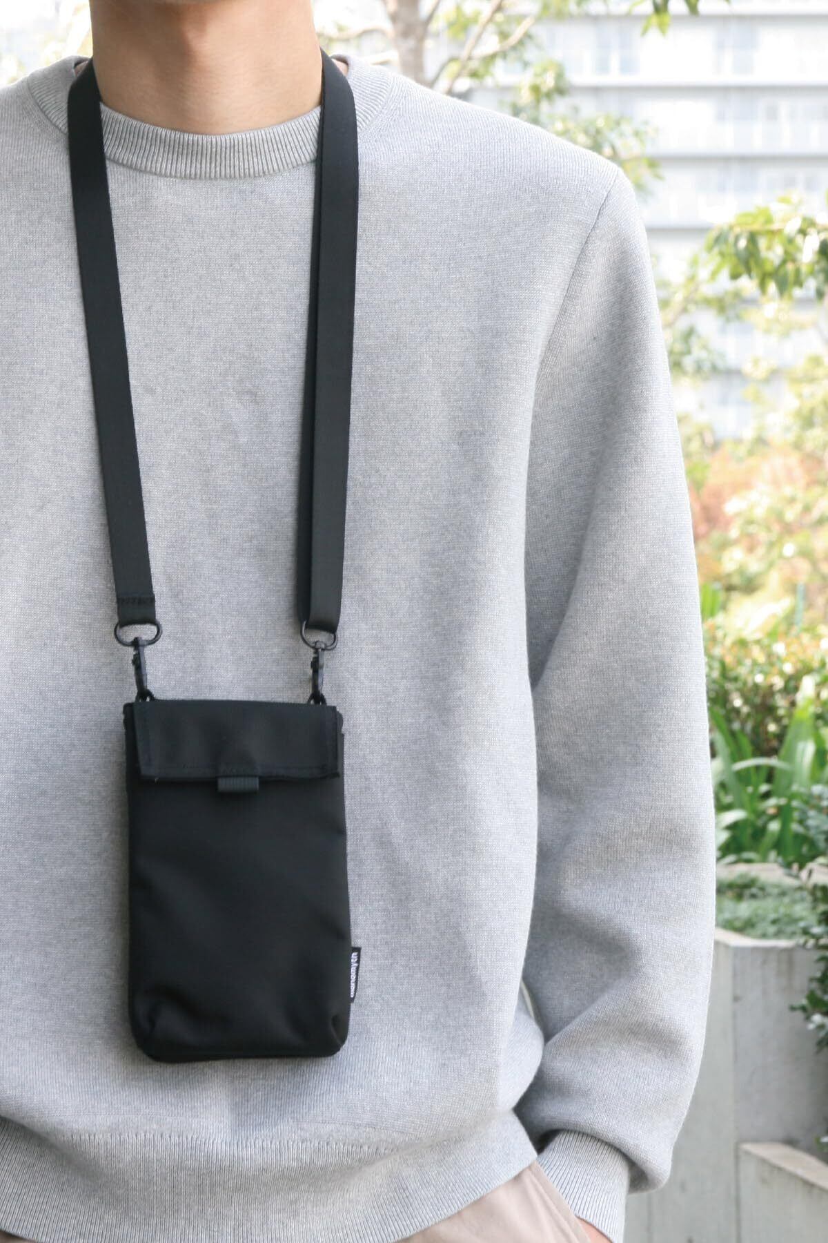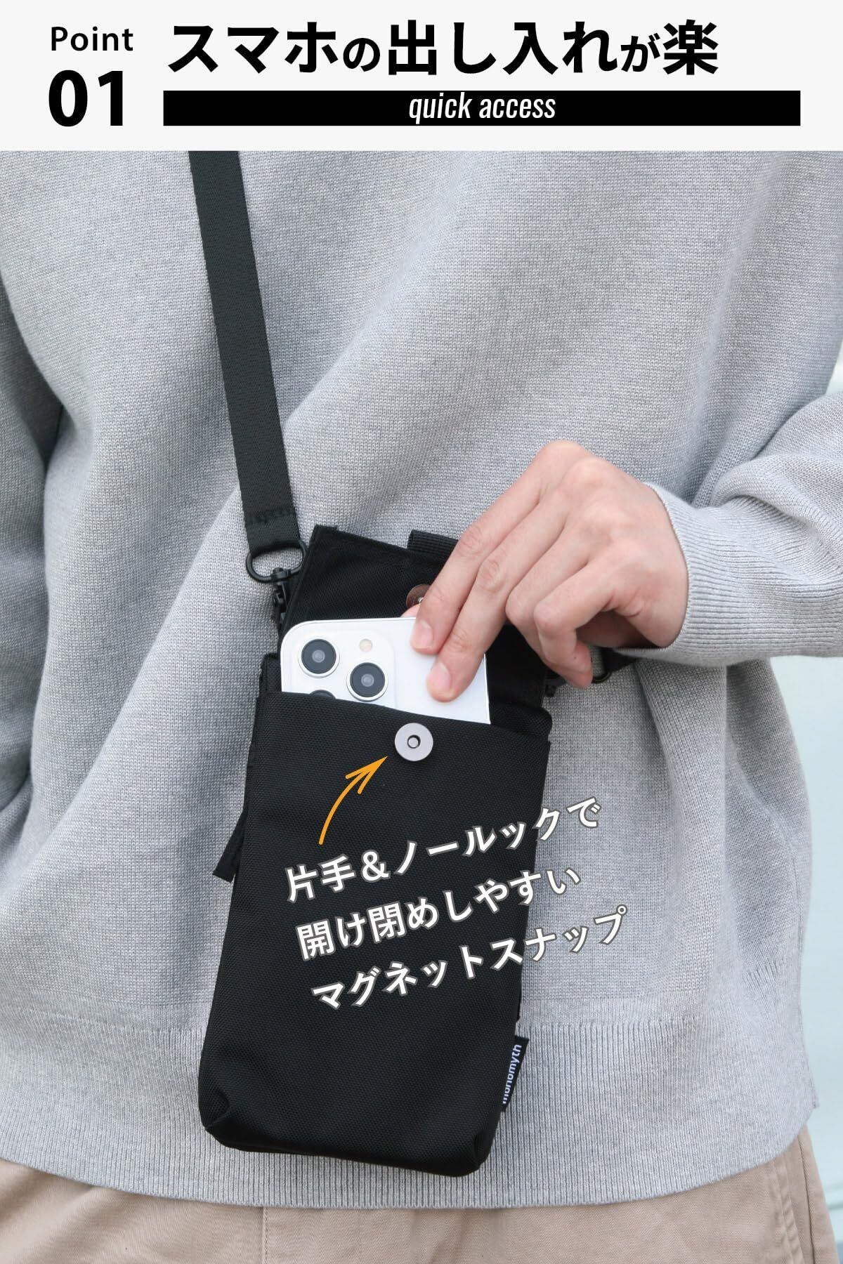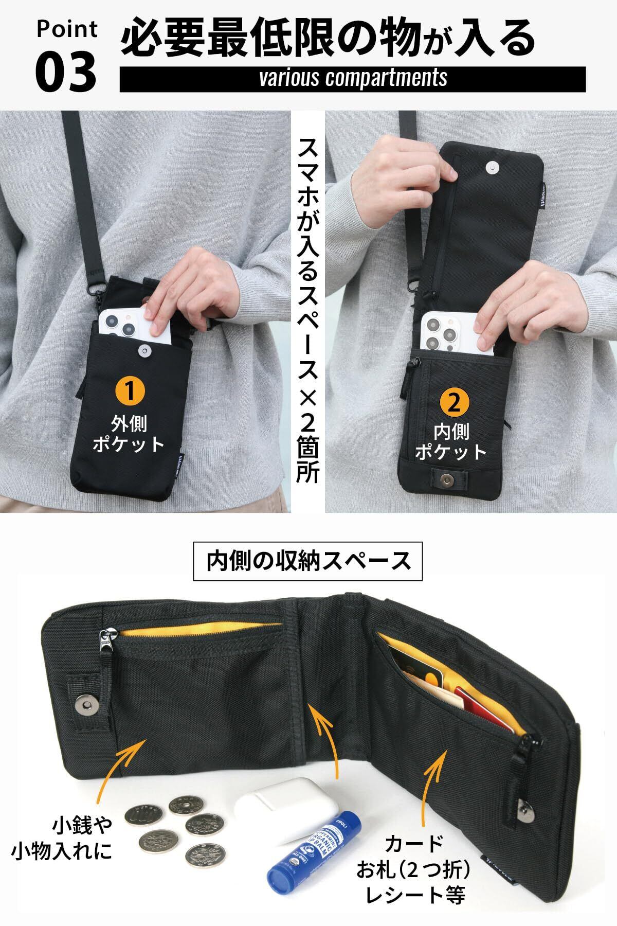【スマホ決済が普及した今、必要最低限の物を持ち歩くためのデザインとは?】を追求した、スマホサコッシュ。ウォレット機能付、必要最低限の小物も入るスマートフォンポーチ。