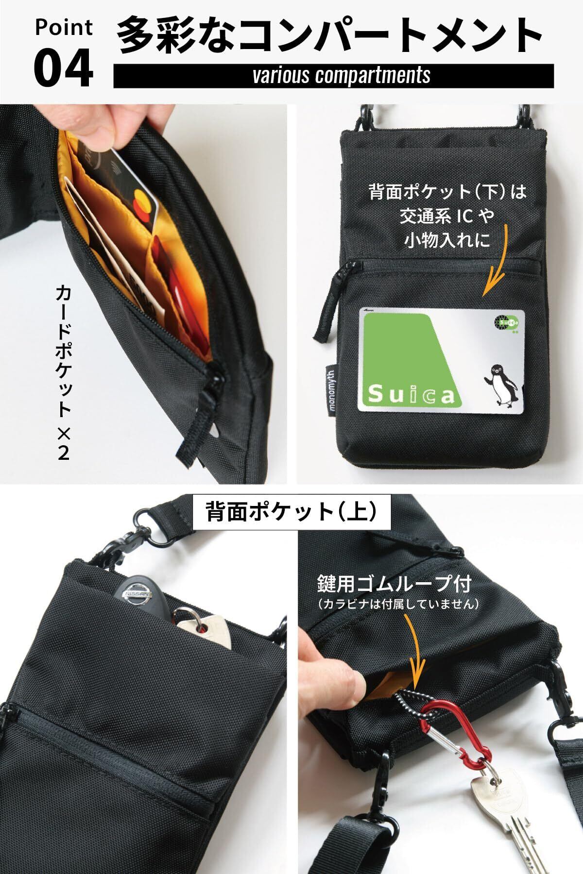 【スマホ収納スペース×2箇所】前面ポケットはすぐに取り出せて便利、電車やバスでは内側ポケットに収納するなどセキュリティーを配慮した使い方が可能 【背面ファスナーポケット】交通系ICカードを入れるのに便利。マチがあるのでイヤホンやリップなど小物収納も。【収納可能なサイズは?】スマホは縦17cm×横9cm×厚さ1cm位まで。パスポートも入ります。スマホ収納機種例:iPhone 15 Pro Max