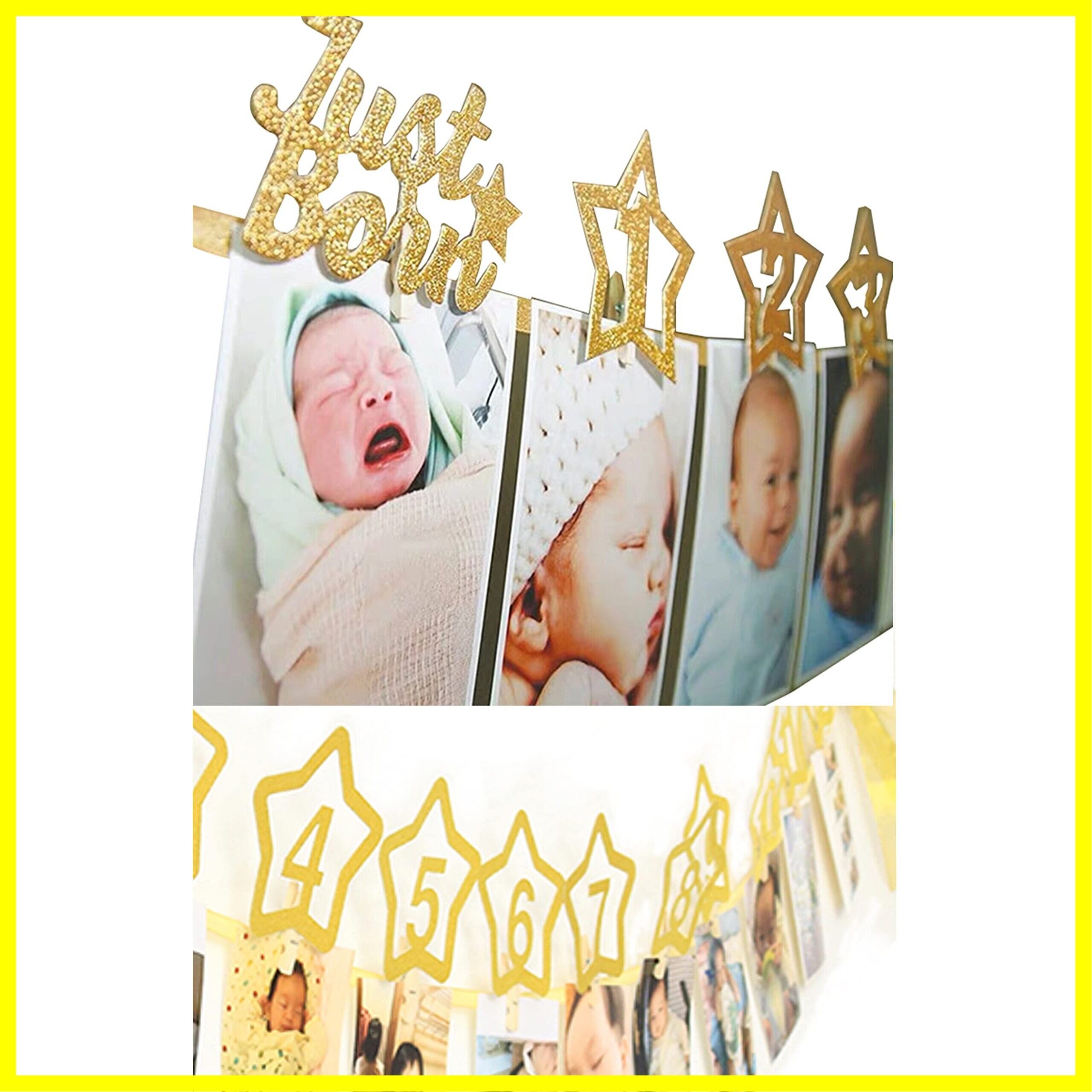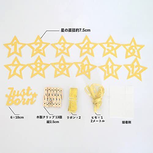 ✨1歳のお誕生日の飾り付けに✨ 生まれた時から1ヶ月ごとの写真を12枚飾れます。お子様の大切な1歳のお誕生日に世界に一つだけのバナーを作ってあげてください!!作り方は簡単!星に木製クリップを付けてお子様の1ヶ月ごとの写真と付属のヒモを挟むだけです。壁に貼ることも、天井や窓に吊るすこともできます。