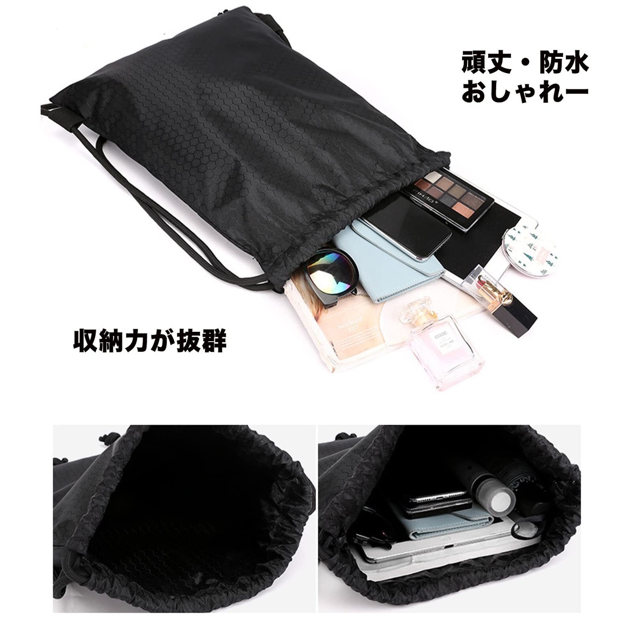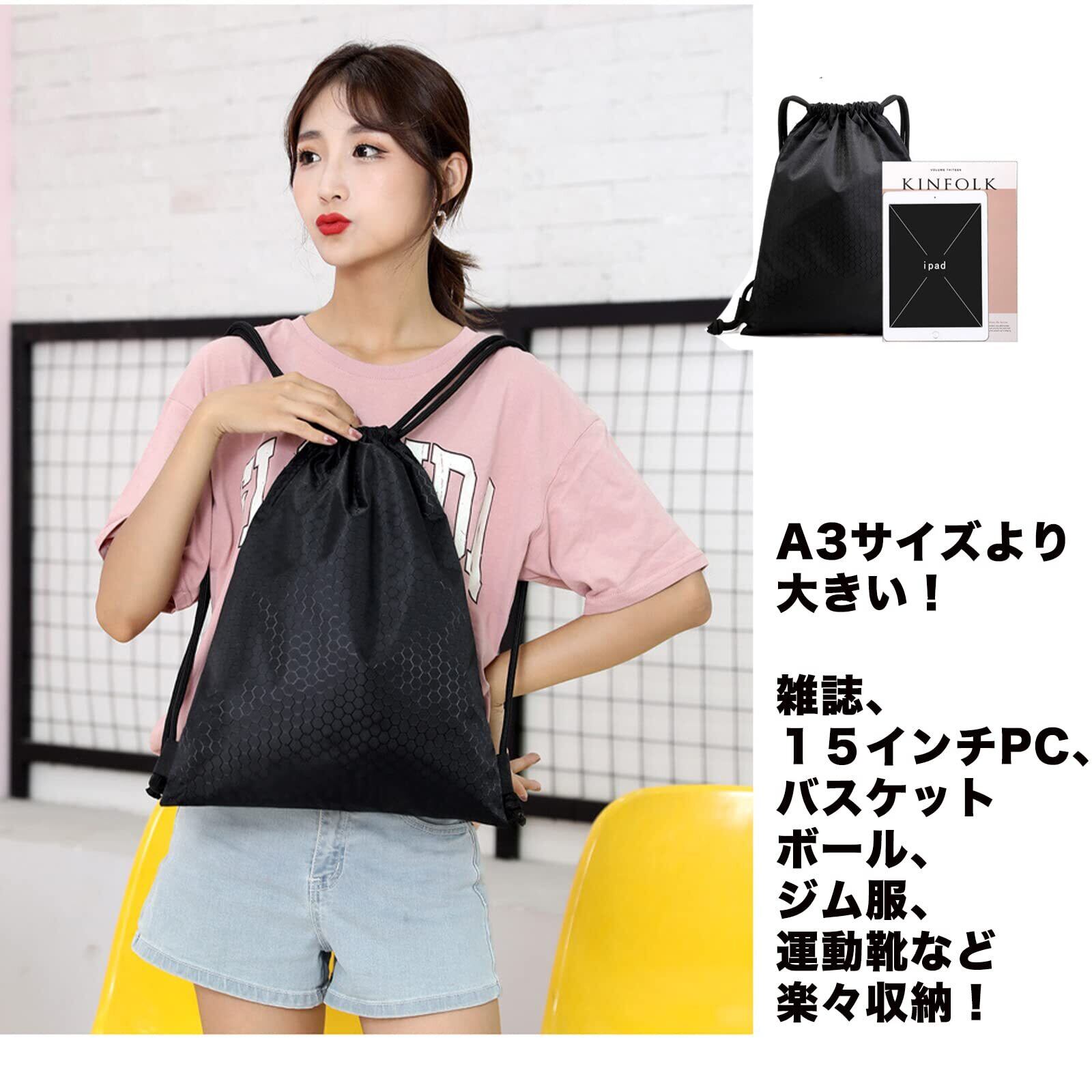 ジムサック スポーツバッグ ナップサック リュックサック 防水バッグ ケース 巾着 シューズ収納 軽量 水泳 部活 サークル 運動 旅行 キャンプ 小物防水袋1枚つき ブラック