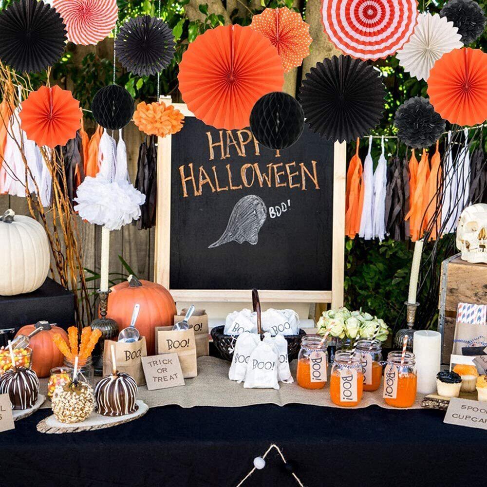 【ハロウィン ペーパーファンセット】①1 x 3mの三角形ペナント ②8 x 25cm ペーパーポンポン(黒*4+オレンジ*4) ③6 xペーパーファン(20cmx2+30cmX2+40cmx2) ④4 x25cm透かし彫りペーパーファン ⑤2x 2mサークルペーパーガーランド。ハロウィン飾り付けセットです。これだけでおしゃれな空間にコーディネートできます。ハロウィン気分をグッと盛り上げます。ハロウィンには欠かせないハロウィンペーパーファン大集合!