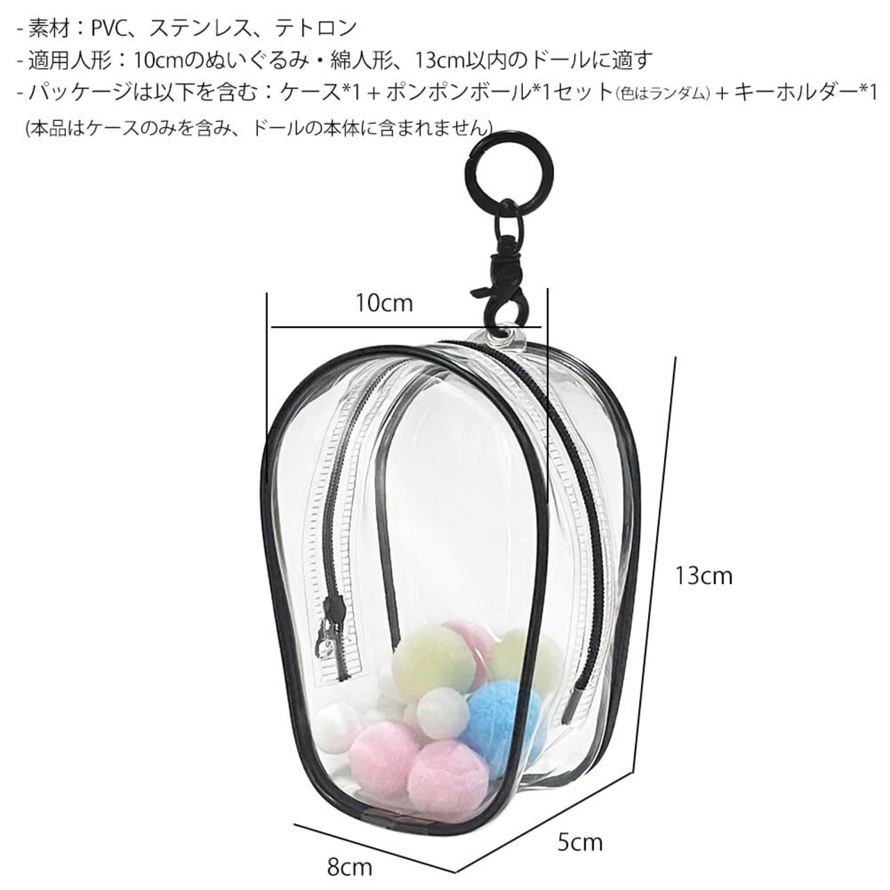 【仕様】製品名前:頭でっかち型ぬいぐるみポーチ・痛バック。パッケージは以下を含む:ケース*1+ポンポンボール*1セット(色はランダム)+キーホルダー*1。素材:PVC、ステンレス、テトロン。サイズ:上部の幅10cm*底部の幅8cm*厚さ5cm*高さ13cm。適用人形:10cmのぬいぐるみ・綿人形、13cm以内のドールに適す。*購入する前に人形のサイズを測ってください。カラー:ブラック。