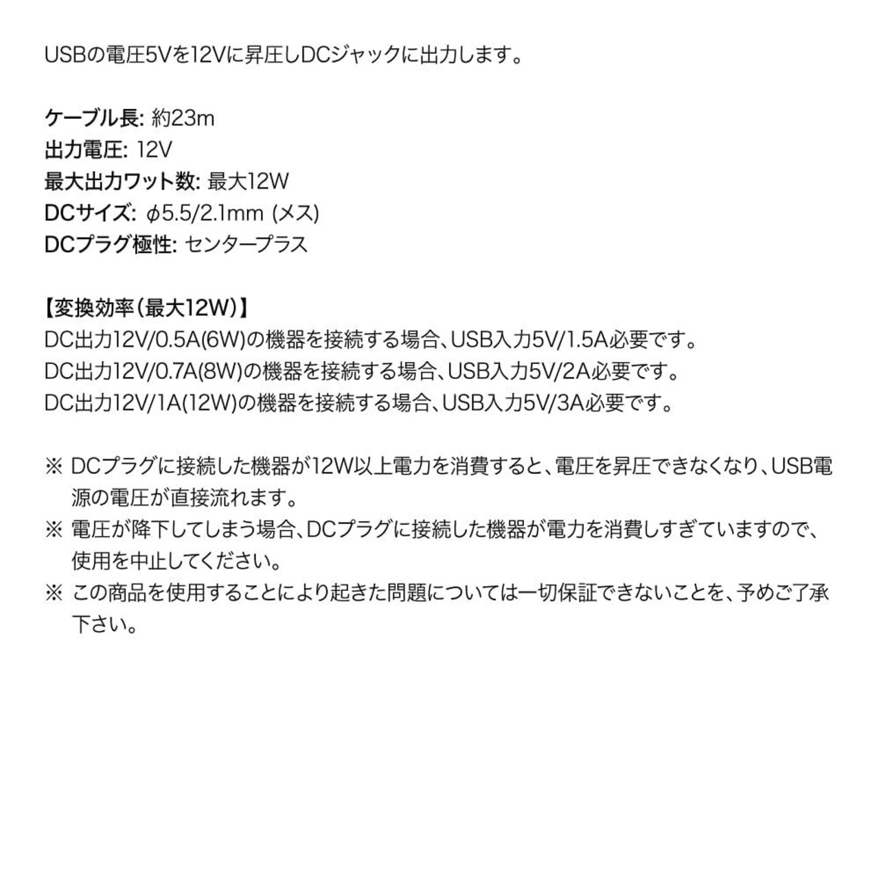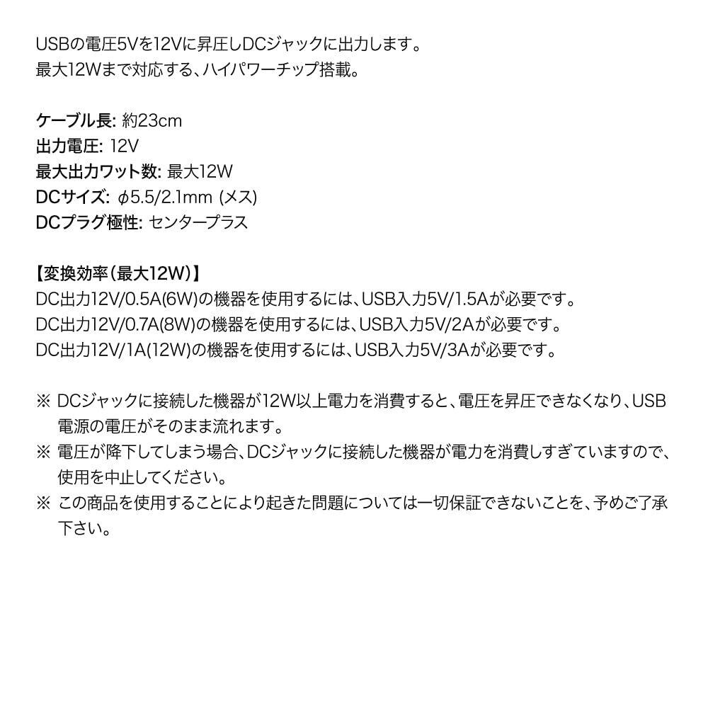 KAUMO USB → DC12V 昇圧 12W対応 DCジャック (DCメス φ5.5/2.1 センタープラス) 変換ケーブル