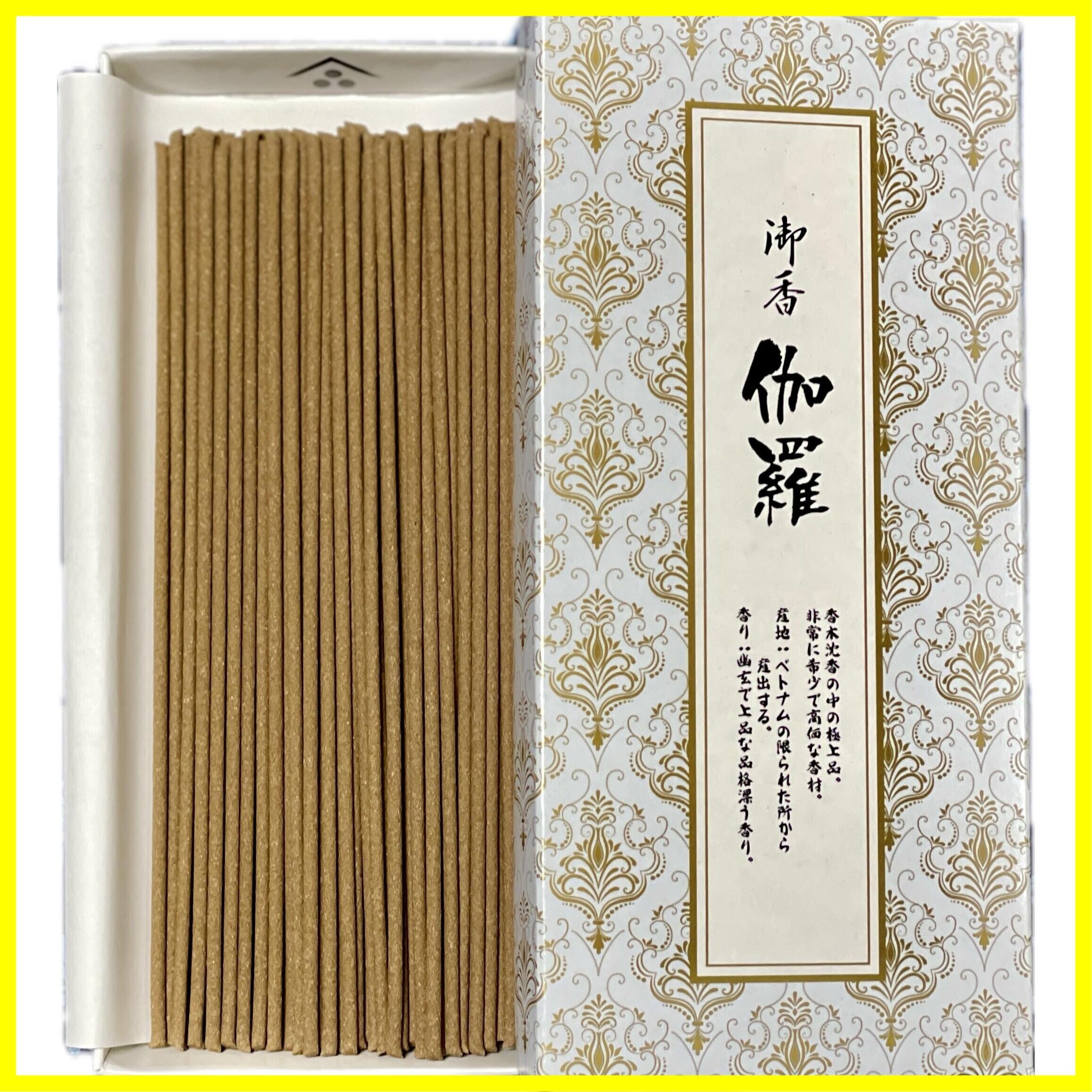 伽羅の魅力 ●極めて希少な天然香木 —— ベトナムの限られた産地からのみ産出される貴重な香材。 ● 幽玄で上品な香り —— 深みのある優雅な香りが、空間を格調高く包み込みます。 心を整える時間 —— 一本の燃焼時間は約30分。日常の喧騒を忘れ、心を鎮める贅沢なひとときを。 ●上質な逸品をお求めの方へ —— 仏事や瞑想、贈り物にも最適。香りの芸術を堪能してください。