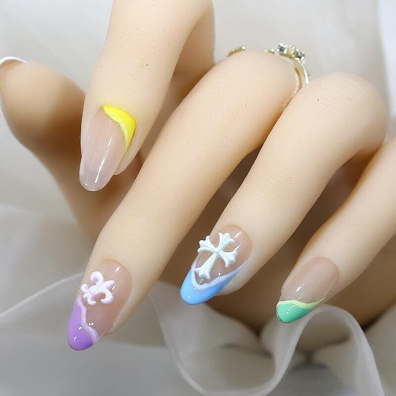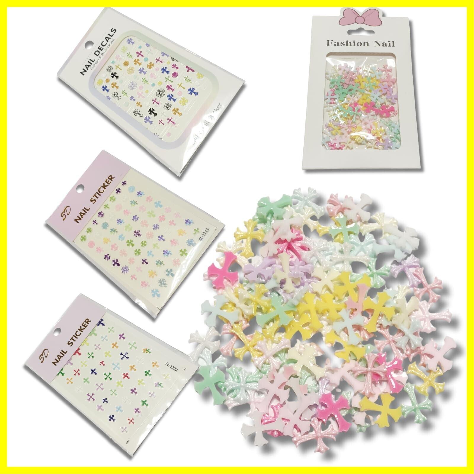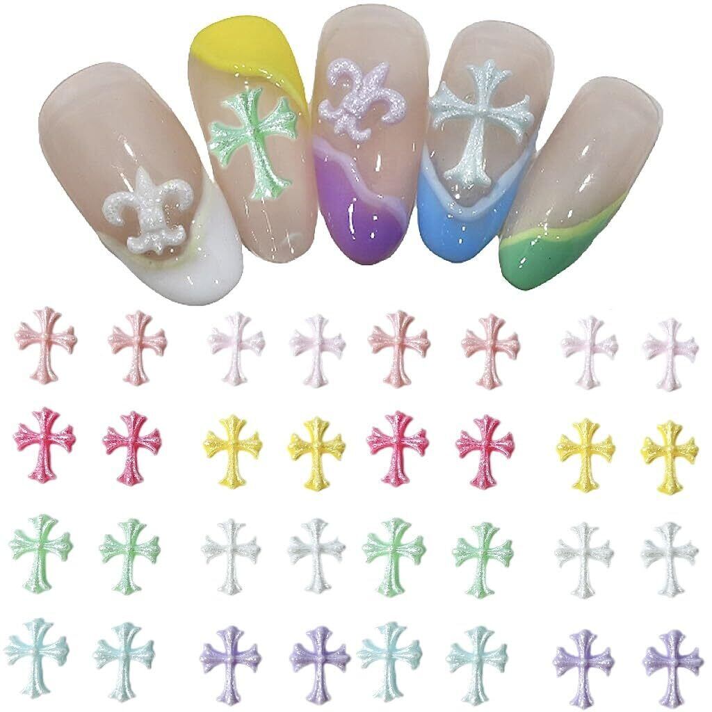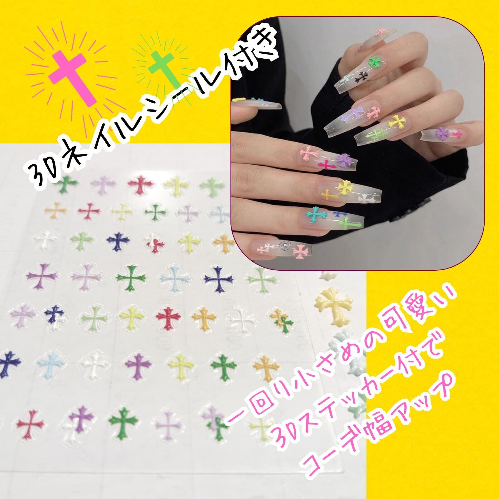 十字架、あしらったネイルパーツ。カラフルでかわいい。ネイルシール3種もセットでコーデ幅アップでお得