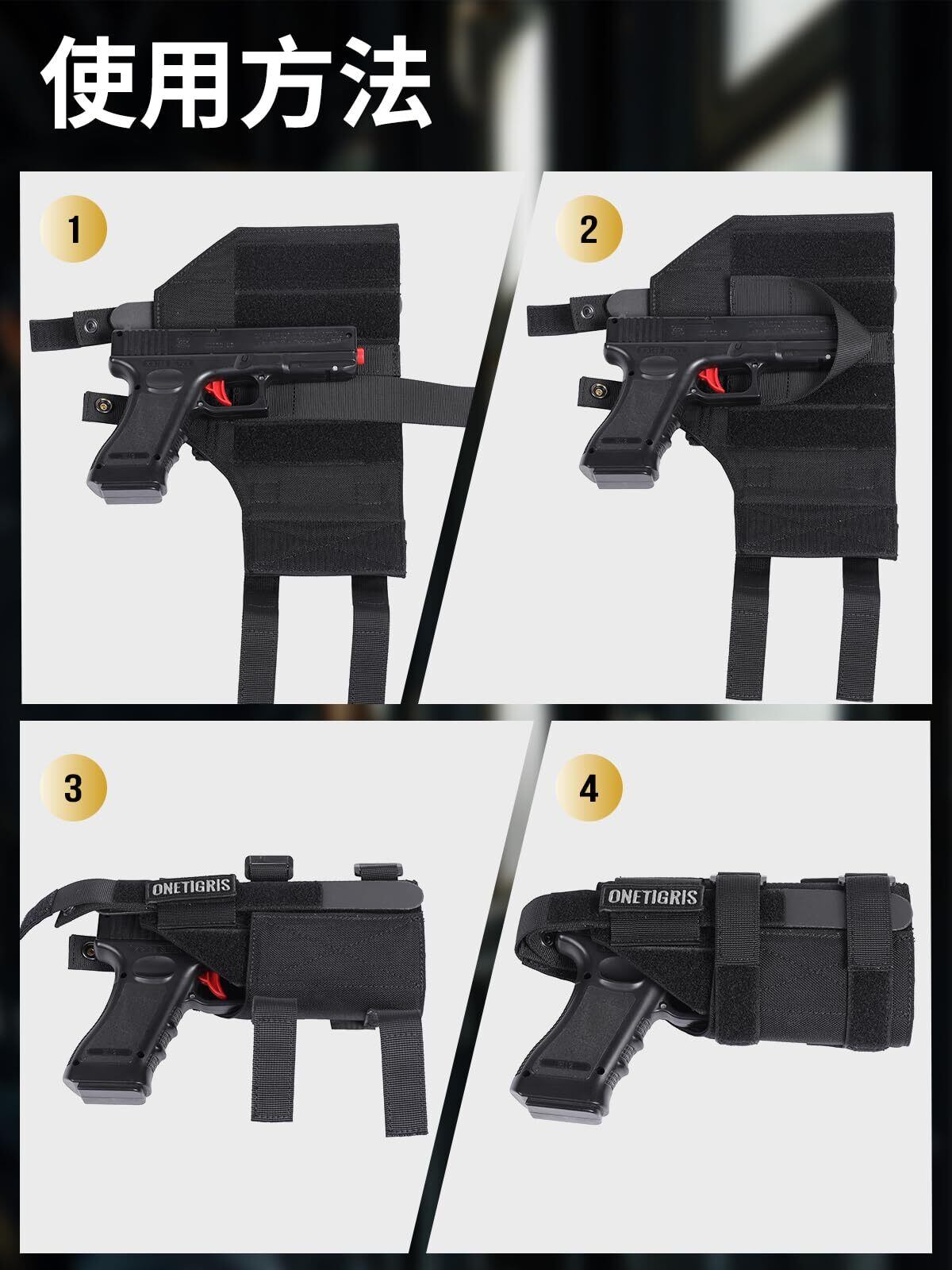 自由調節:2本のベロクロでハンドガンを固定でき、微調整できるのでほとんどの型に合わせやすい。
