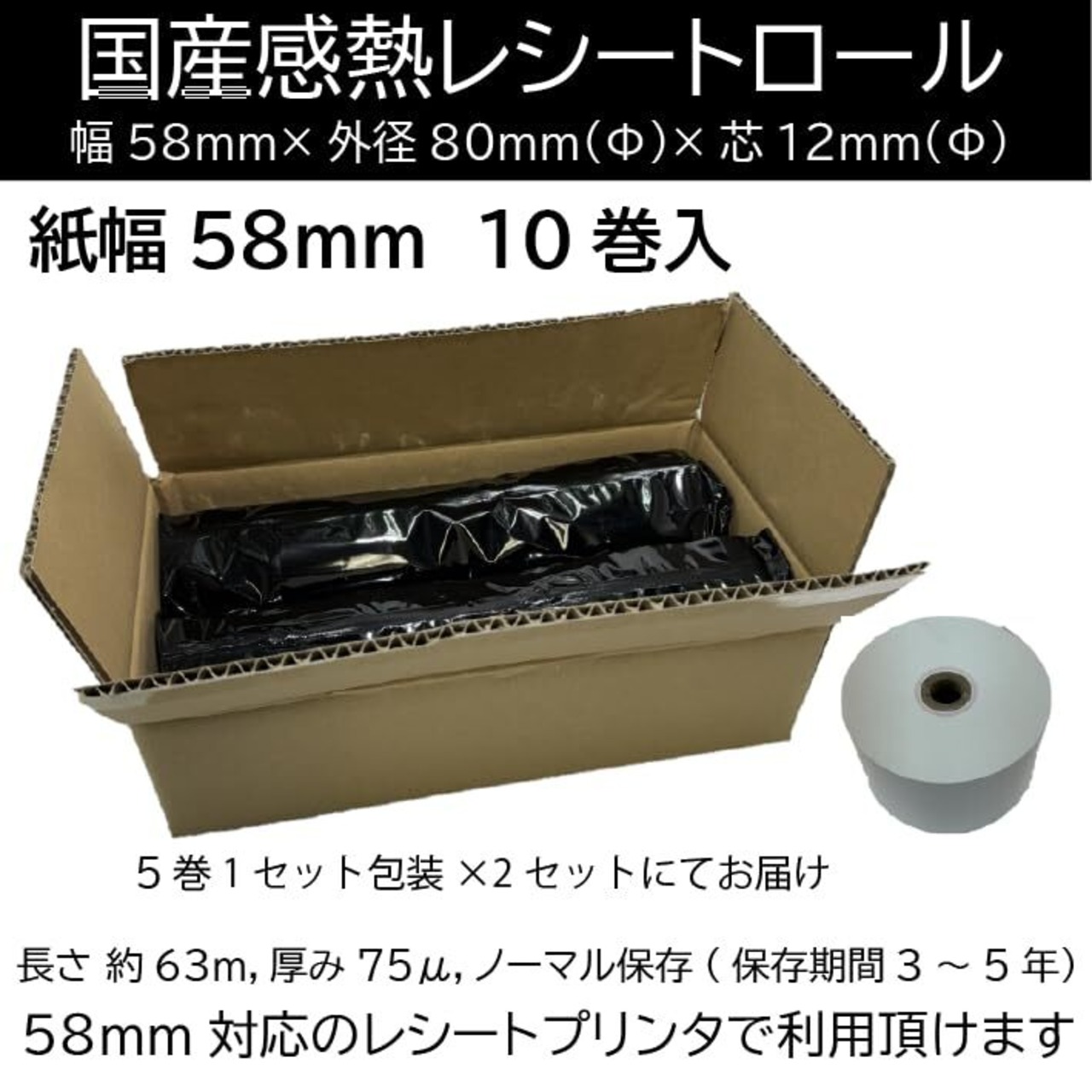 【10巻 5巻×2セット】レシートロール 感熱紙 紙幅 58mmx外径 80mm x 長さ約63m 厚み 75μ 芯径 12mm【国産:三菱製紙】(ノーマル保存)
