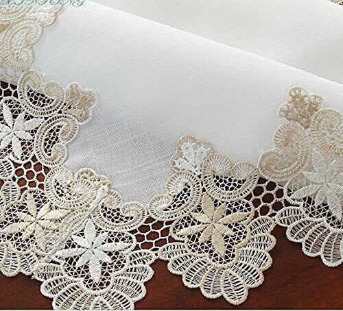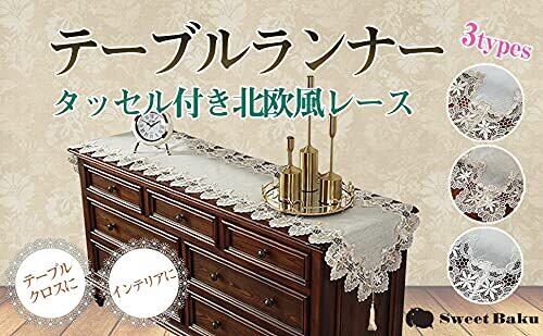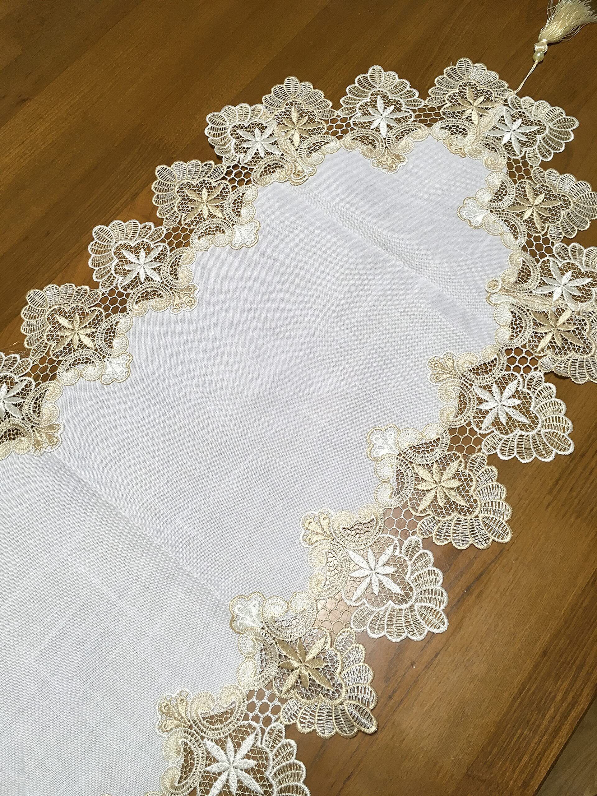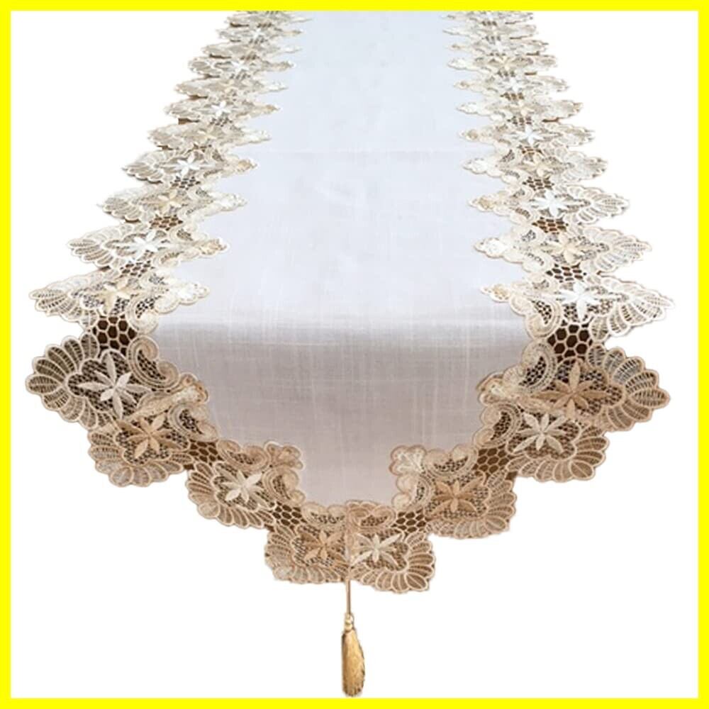 SweetBaku テーブルランナー 欧風レース縁取り タッセル付 テーブルセンター クロス マット 食卓 リビング 寝室 45×150㎝ (白地ベージュレース)