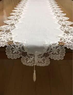 【特徴】美しいヨーロピアンレースの縁取りとタッセル付きのテーブルランナー