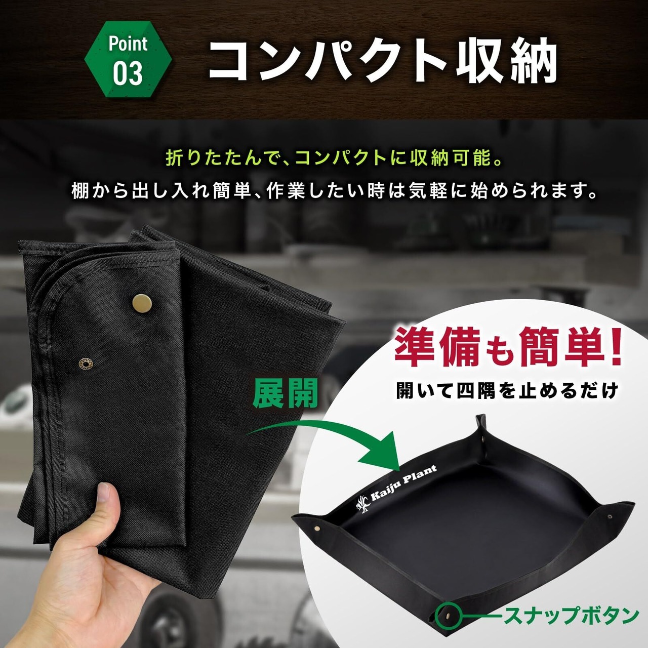 【トレイ形状で飛び散り防止】4隅のボタンを留めてトレイ形状に。厚手の生地でしっかり形状を保ち、植え替え時の用土の飛び散りを防ぎます。 使わないときは折りたたんでコンパクトに。DIY作業マットとしてもオススメ。