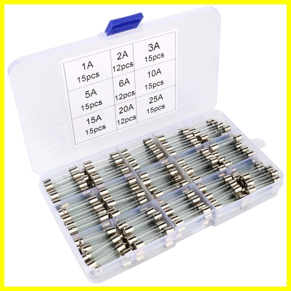 126個 6 * 30mm ガラス管 ヒューズ, 1A / 3A / 5A / 10A / 15A / 25Aのヒューズを各15個, 2A / 6A / 20Aのヒューズを各12個