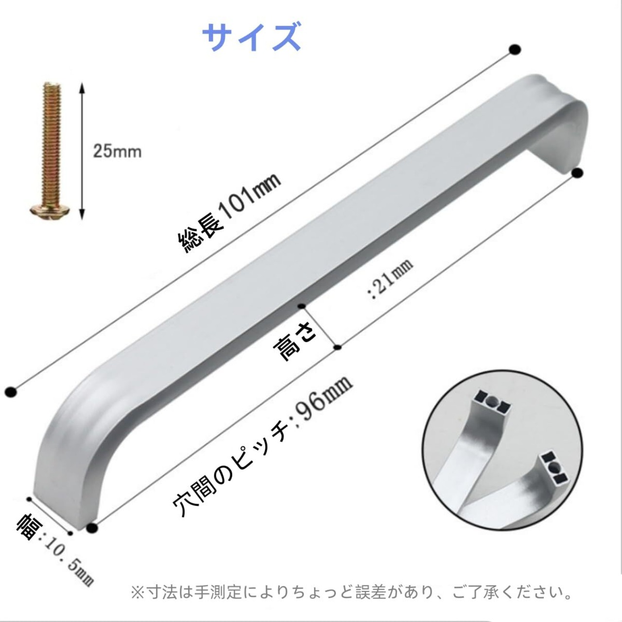 【サイズ】ハンドルの全長は10cm、幅は2cm、ネジ部軸距離は9.6cmです。