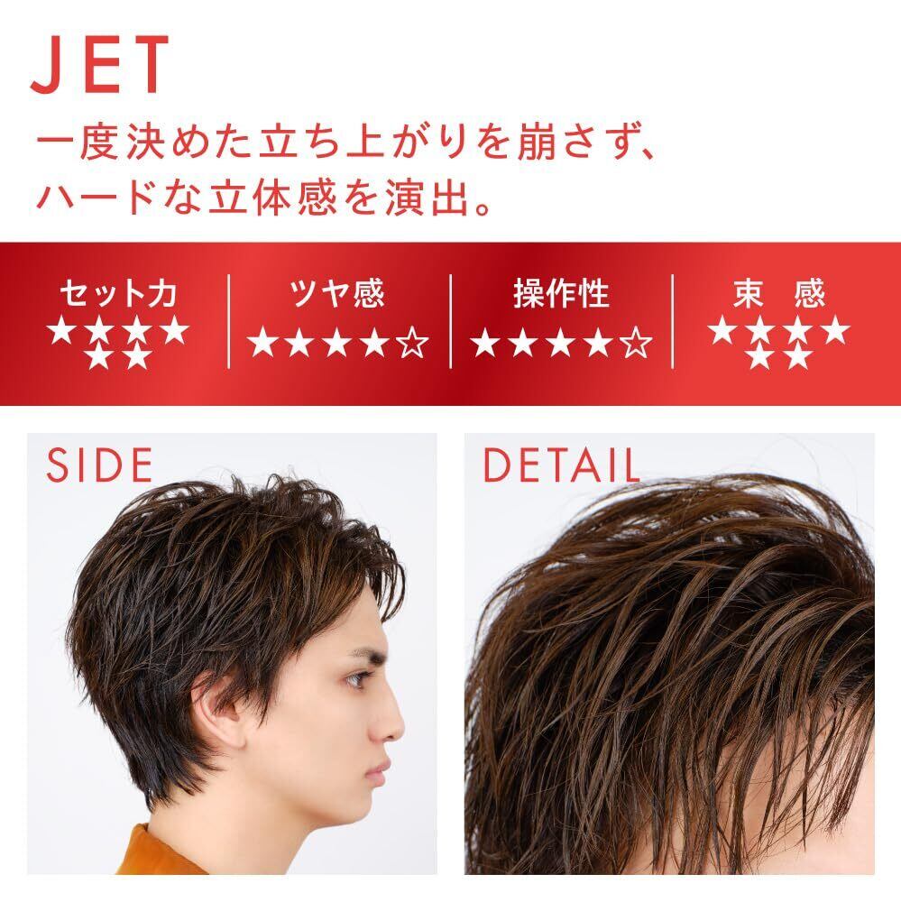 【Point:ワックスの特徴】JET(ジェット):付けただけで簡単に束感が作れる。立ち上げスタイルを崩さないハードワックス。