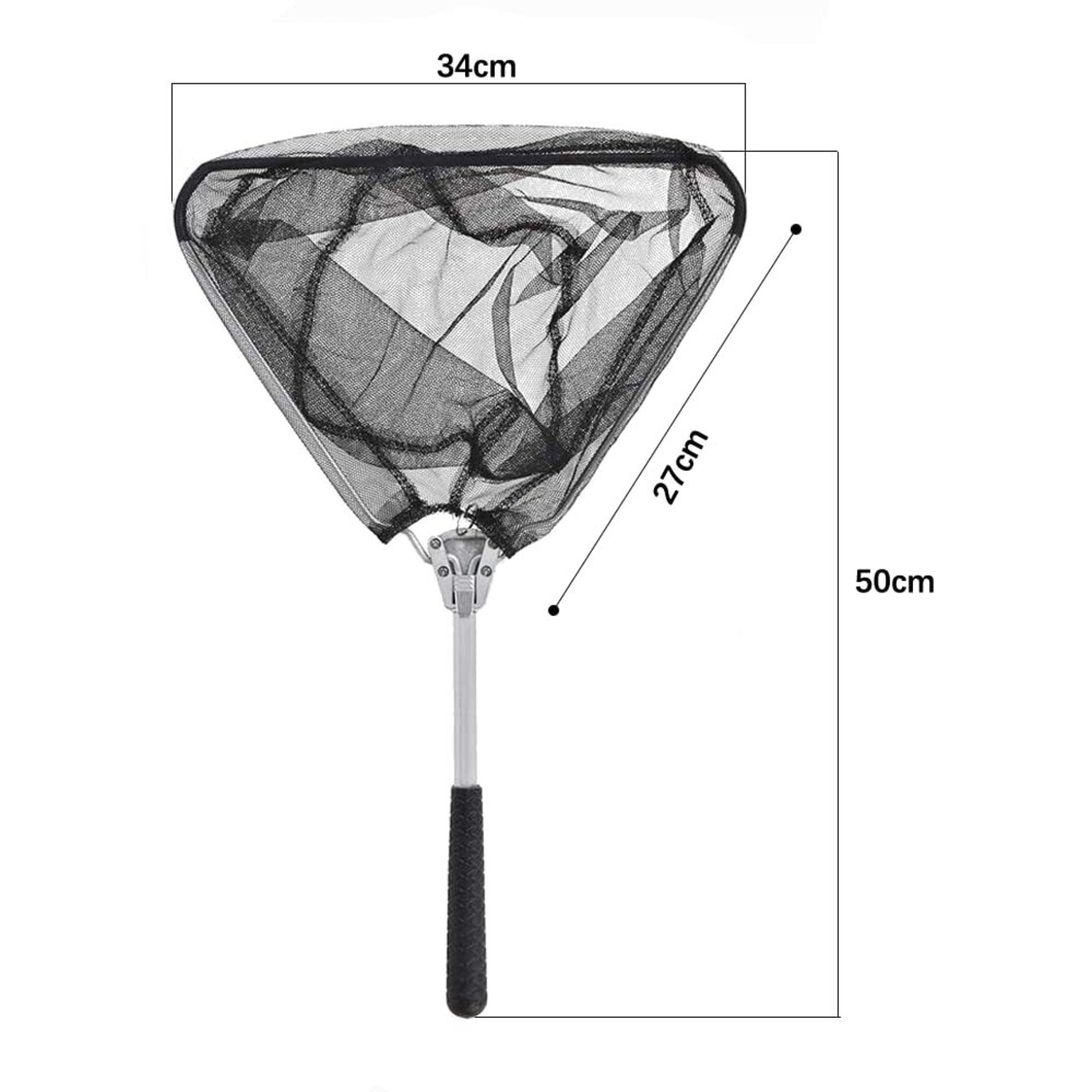【折りたためるタモ網サイズ】全長:約50cm 、折り畳み時 :30cm、網枠直径:三角形の辺の長さ34cm、釣り網深さ:約20cm、ナイロンコーティングネット。柔らかなナイロンコーティングネットは魚へのダメージを抑えます。