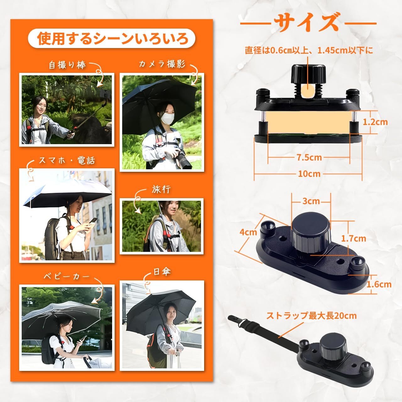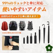 傘のシャフト(中棒)の直径は0.6㎝以上、1.45cm以下に対応します。リュックの肩ベルトは幅7.5㎝以下、厚みは圧縮して1.2㎝以下に対応します。