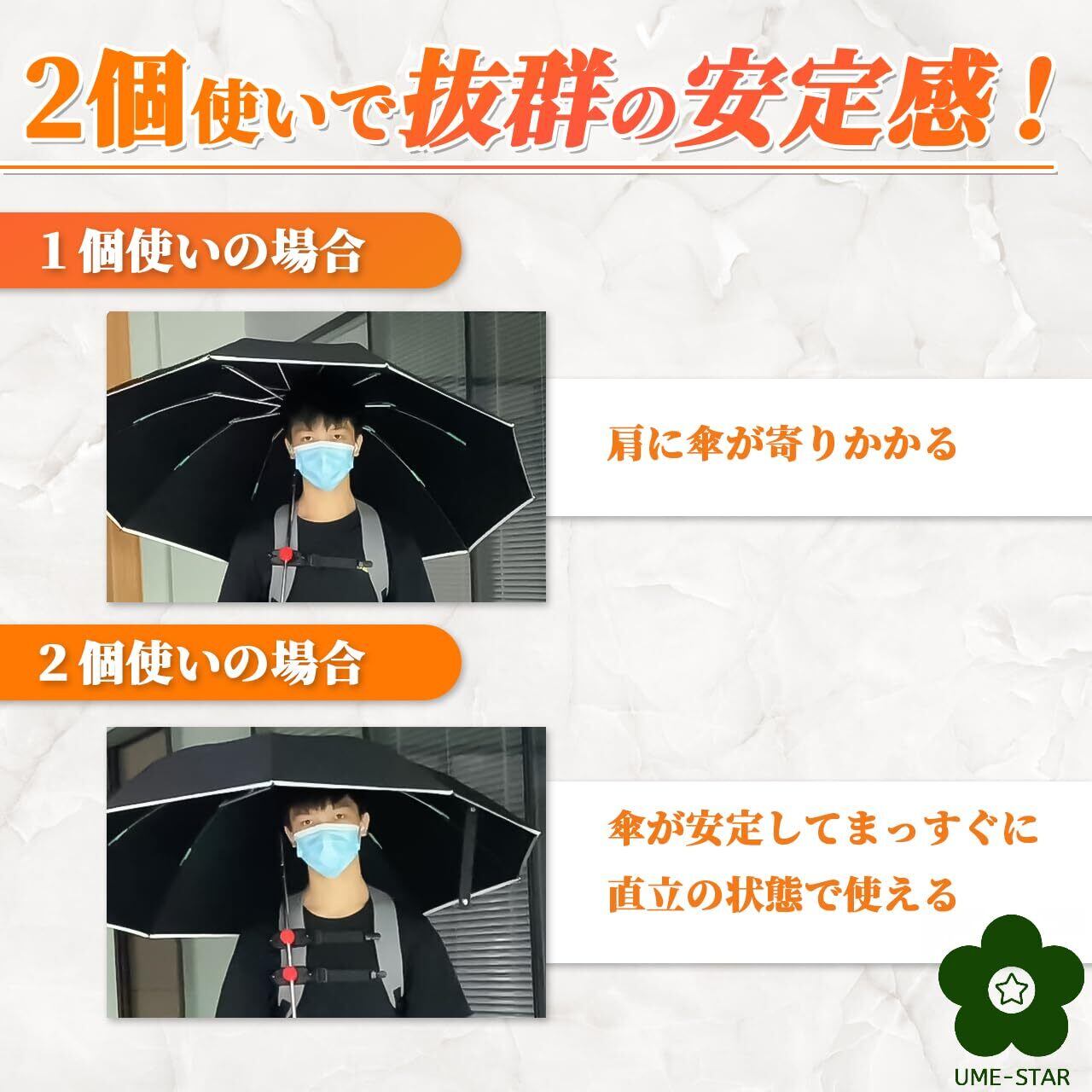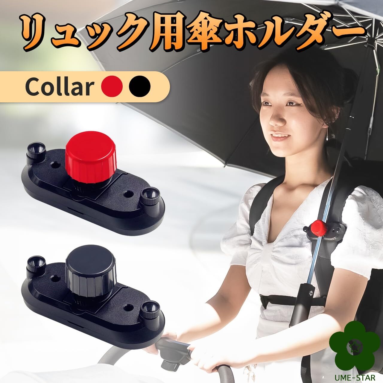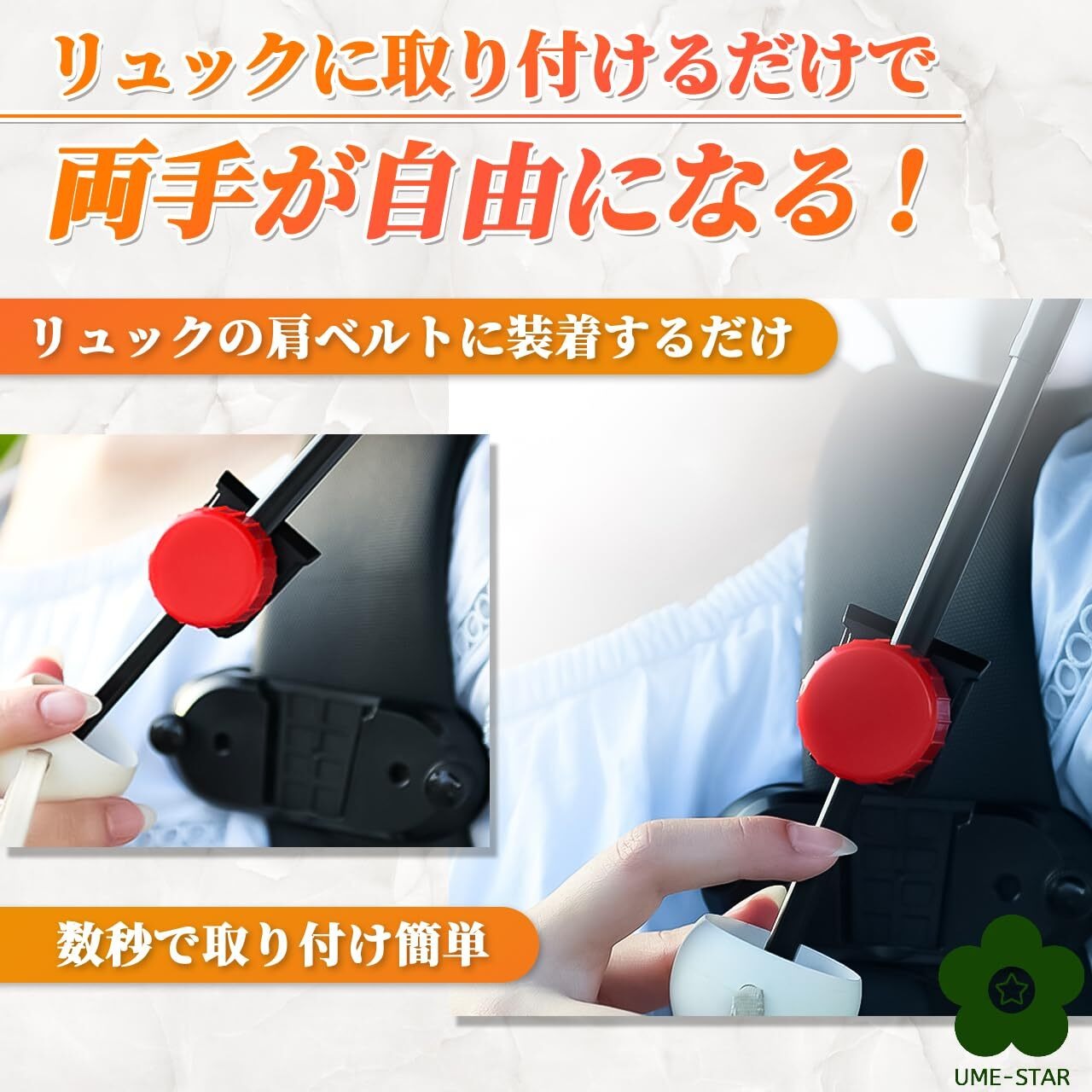 リュックの肩ベルトに装着するだけで、傘を持たずにハンズフリーになるリック用傘ホルダーです。 傘を持つことなく両手が自由に使えるので、カメラ撮影や小さな子供の世話、買い物などの荷物を運ぶときに便利です。