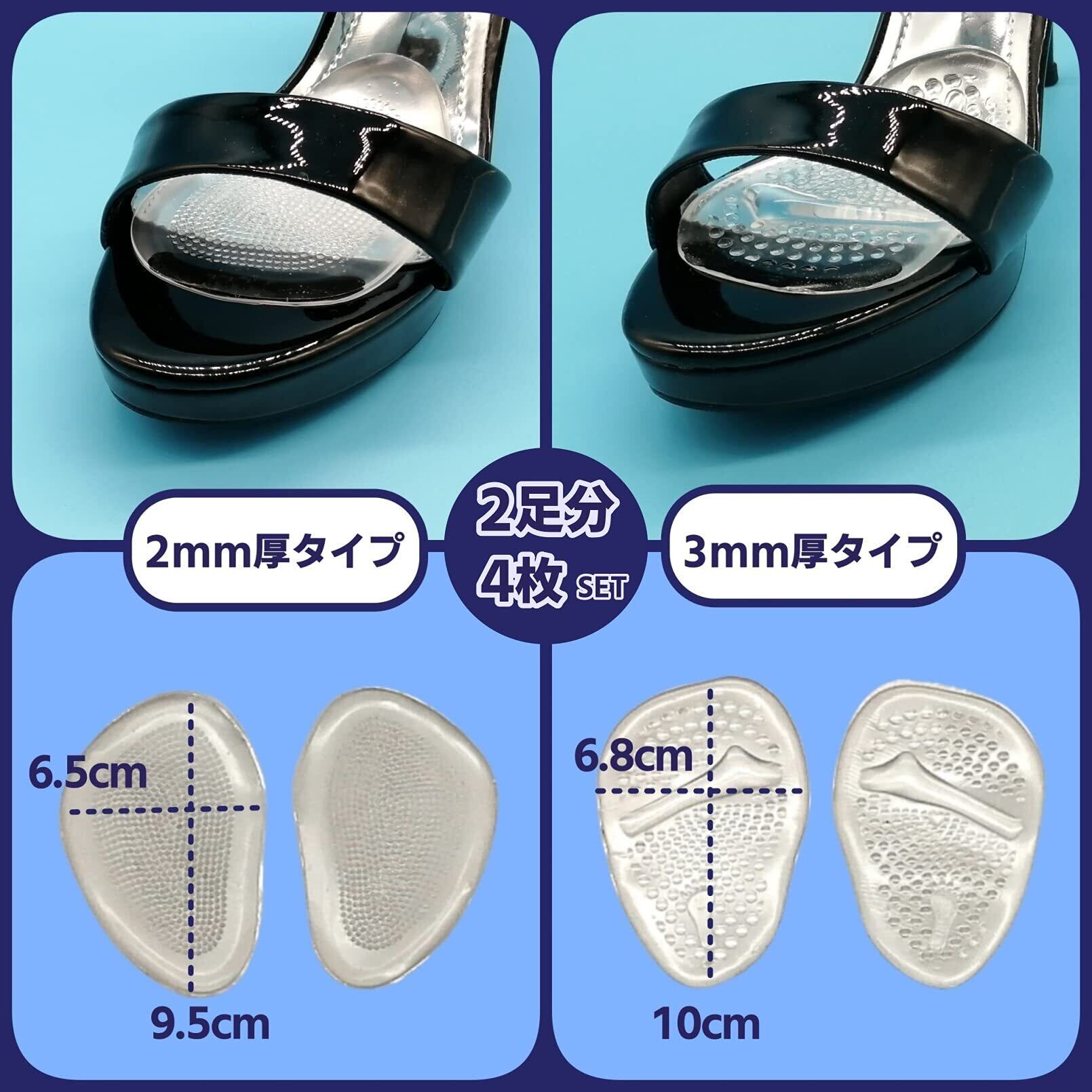 つま先インソールは2mm厚と3mm厚の2足分(4枚)セット!厚さが違う、つま先インソールが最初から2種類あるので、靴に合ったサイズの微調整が可能! 靴のタイプに応じていろいろと試めして、ぴったりフィットを実感して下さい。
