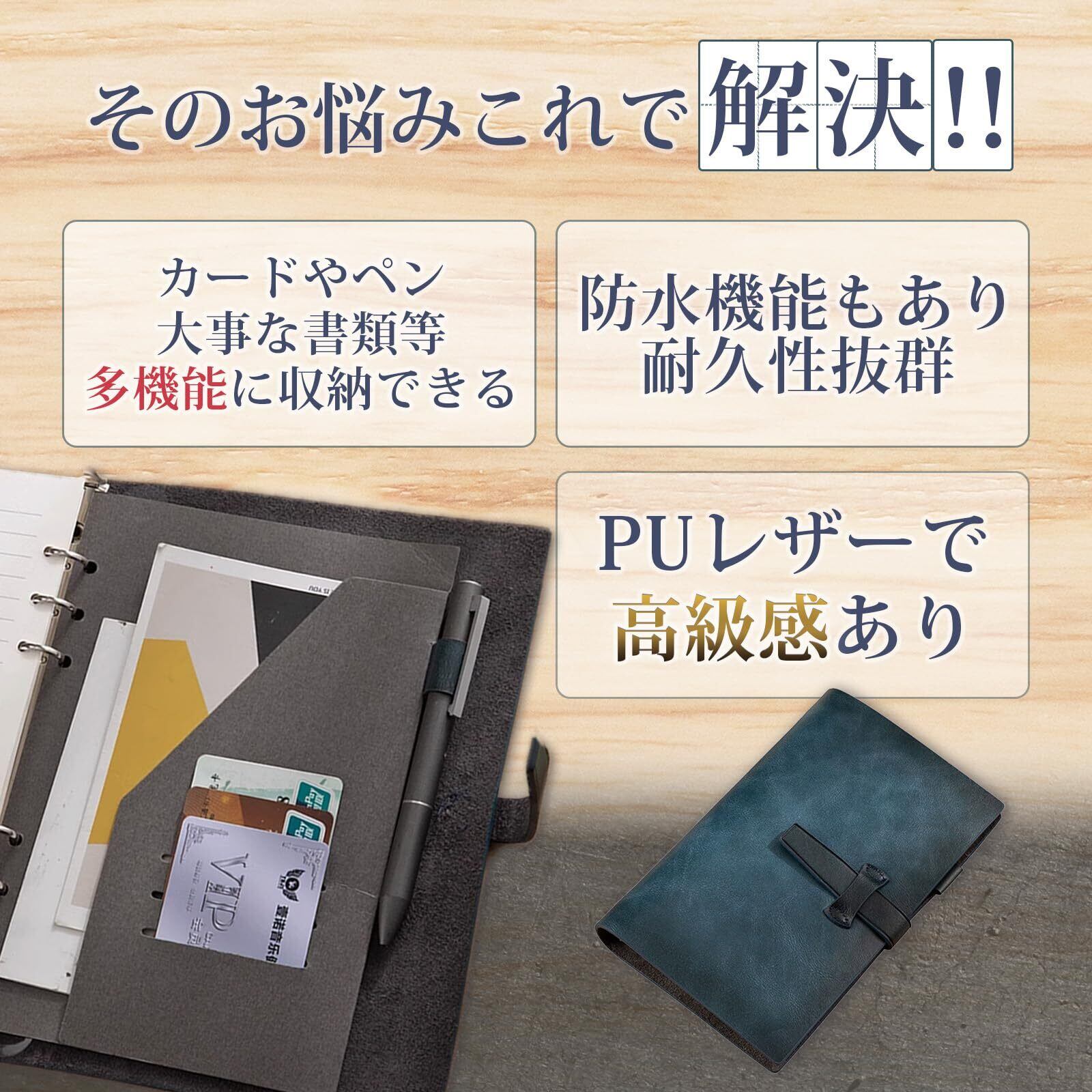 【収納力】 多機能な収納を備えています。ペンホルダーと収納ポケット付きで、名刺、チケット、領収書、お金などを挟んでおくことができます。ベルトがあり使いやすいです。便利さと安心さを両立したシステム手帳です。