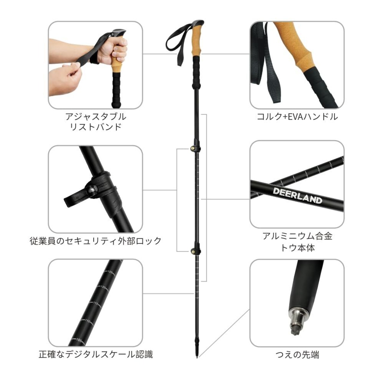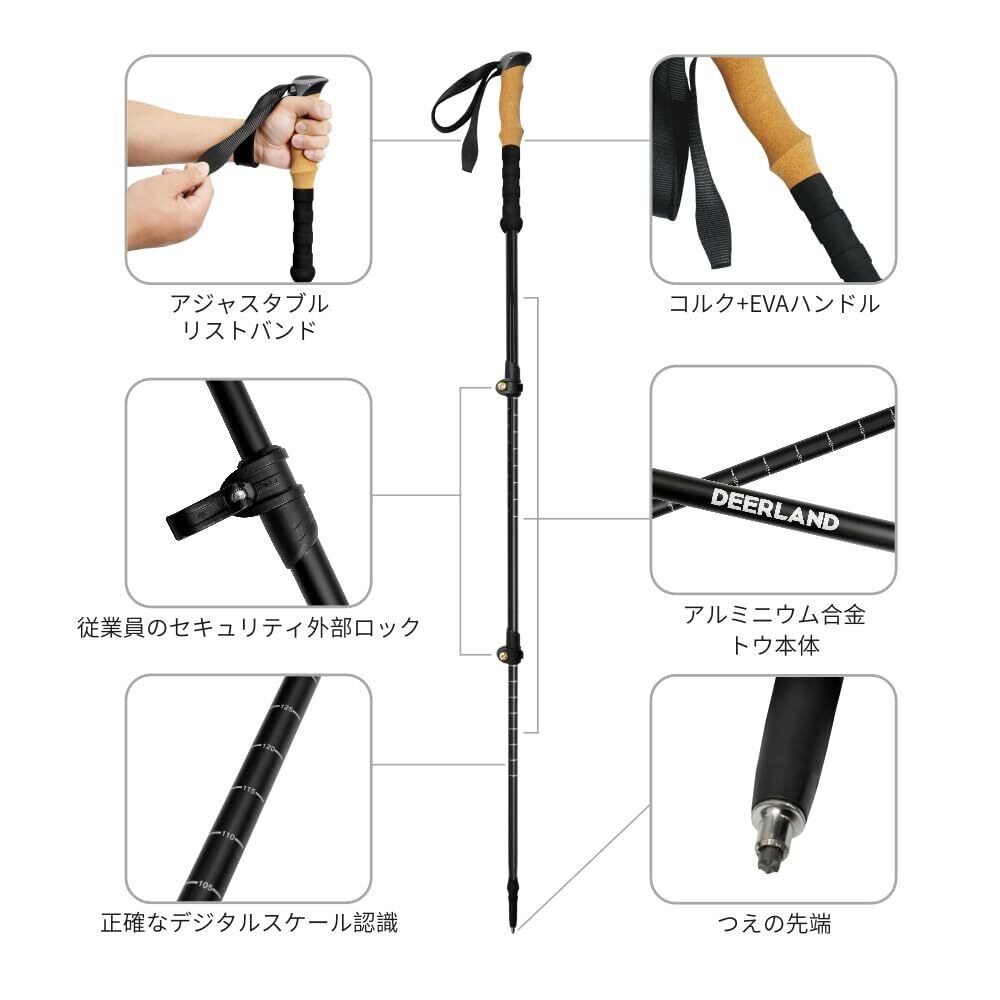DEER LANDアウトドア・トレッキング用のステッキです二本のステッキでできています。杖身はアルミニウム合金製で、頑丈です。持ち手はコルク素材で、持ち心地が良く、汗を吸って滑りにくいです。杖身には安全外鎖が付いており、長さを自在に調節して固定することができます。杖の先は炭素鋼でできていて、丈夫で滑りにくいです。杖の先のカバーと取り外し可能な泥のカバーが付いています。伸ばすと最大135cm、縮めると67cmになります。身長135 ~ 195cmの方向けで、男女兼用です。