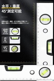 【多角度水平器&見やすい】商品の縦、横面を、建具などの測定物にあてて、4本線アクリル気泡管があり、多角度で精密測定してきます。気泡管:水平・垂直・45°。温度変化が気泡管の品質に影響しません。変形しないで、寿命が長いです。