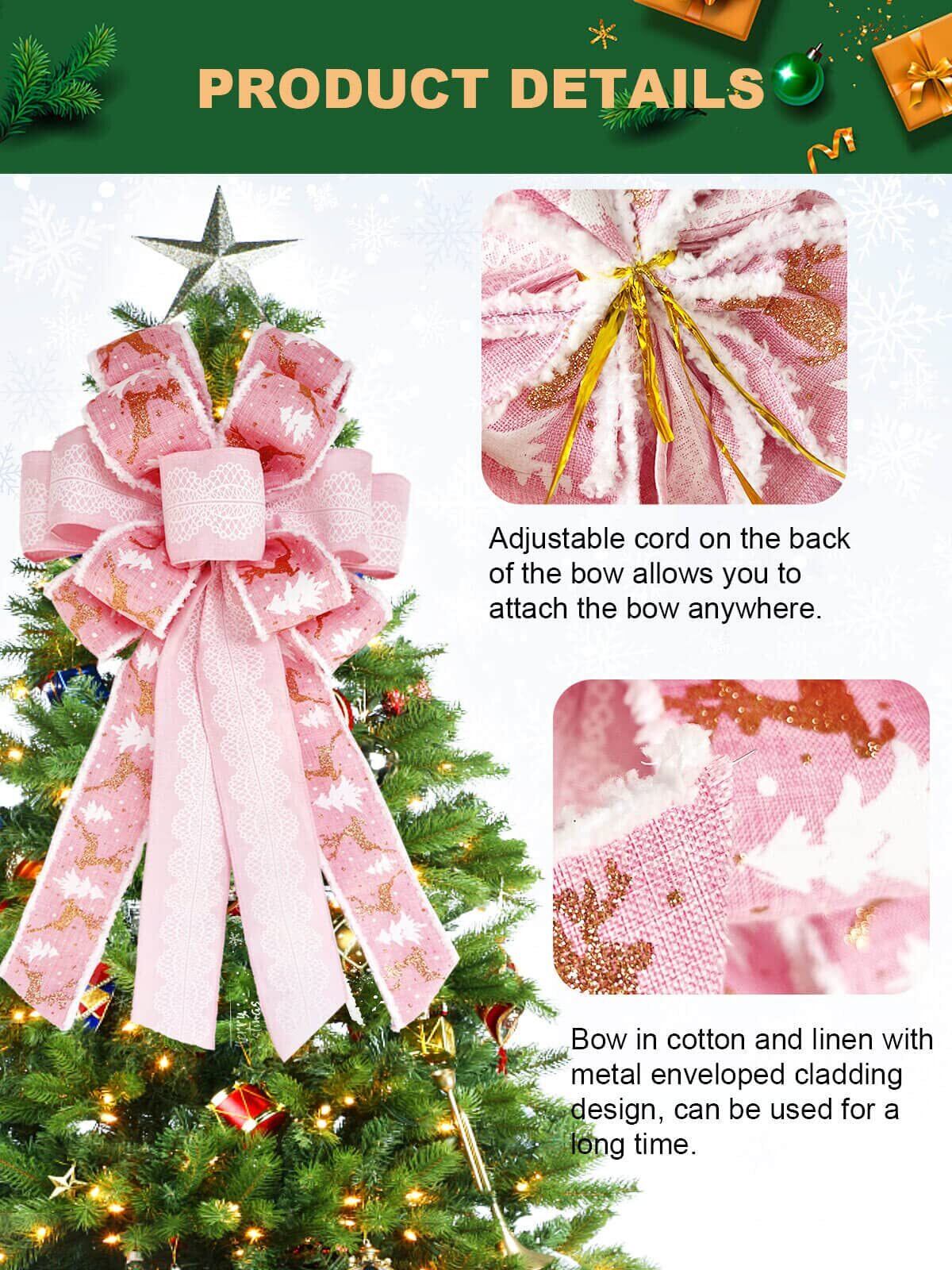 SONGTIY クリスマスツリートッパーボウ、クリスマスツリーとトナカイの手作り蝶結び、21.3x11.1インチ Lサイズ クリスマスデコレーション 結婚式 誕生日 新年パーティー用 (ピンク)