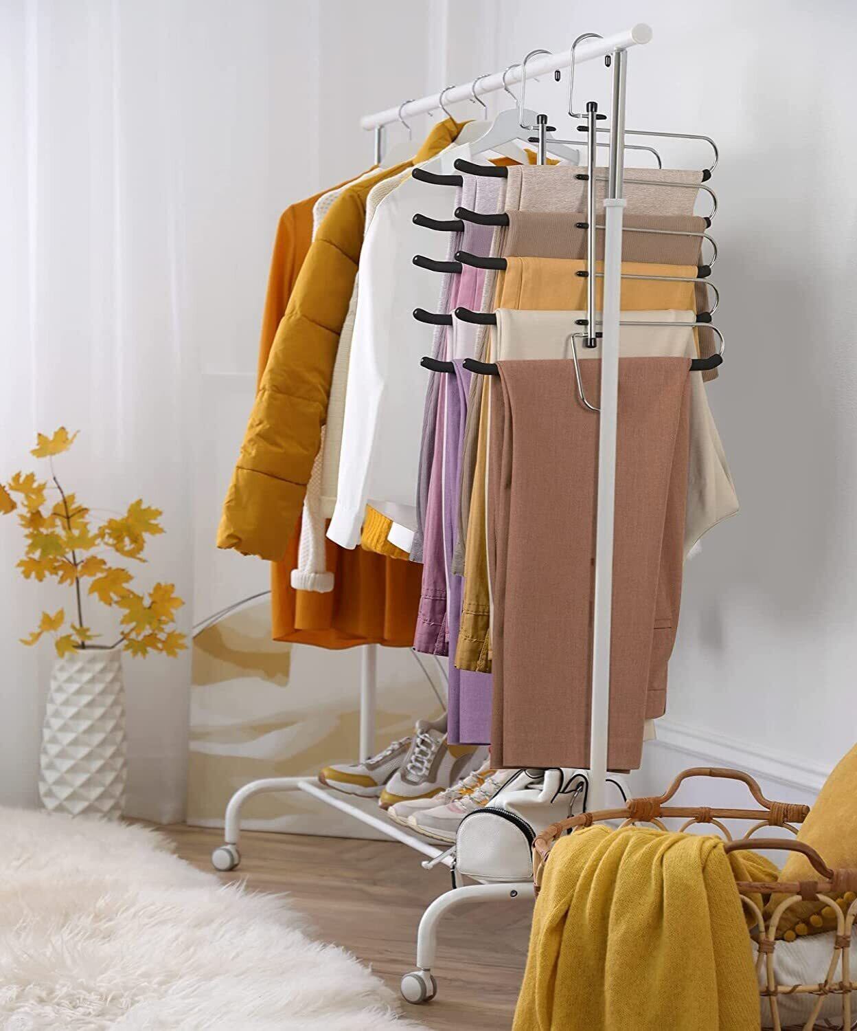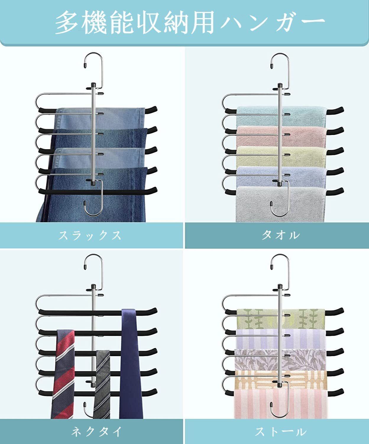 【多機能収納ハンガー】このハンガーはズボン パンツを収納できるだけでなく、スカート、ストール、ベルト、ネクタイ、タオルなども適応します。ズボンを畳む代わりに吊るし、ズボンのシワが減り、アイロン必要ありません。朝の出勤まで時間はたっぷりあります。