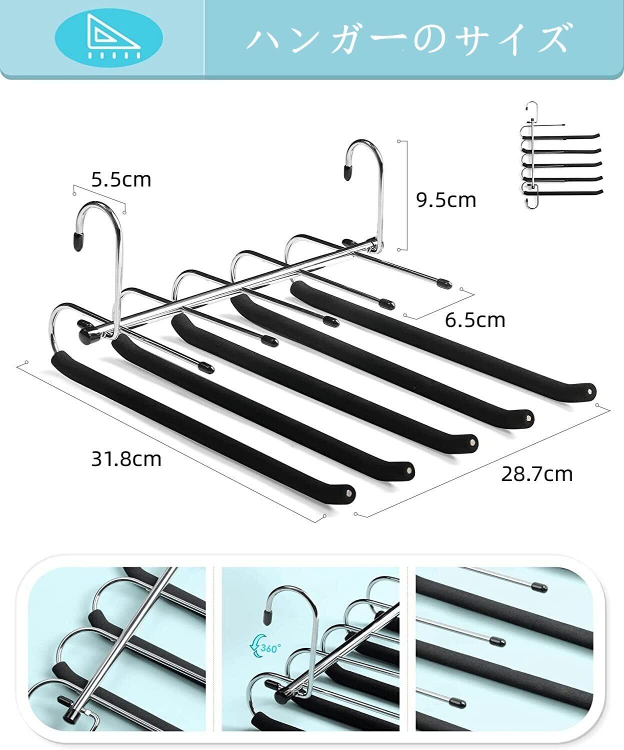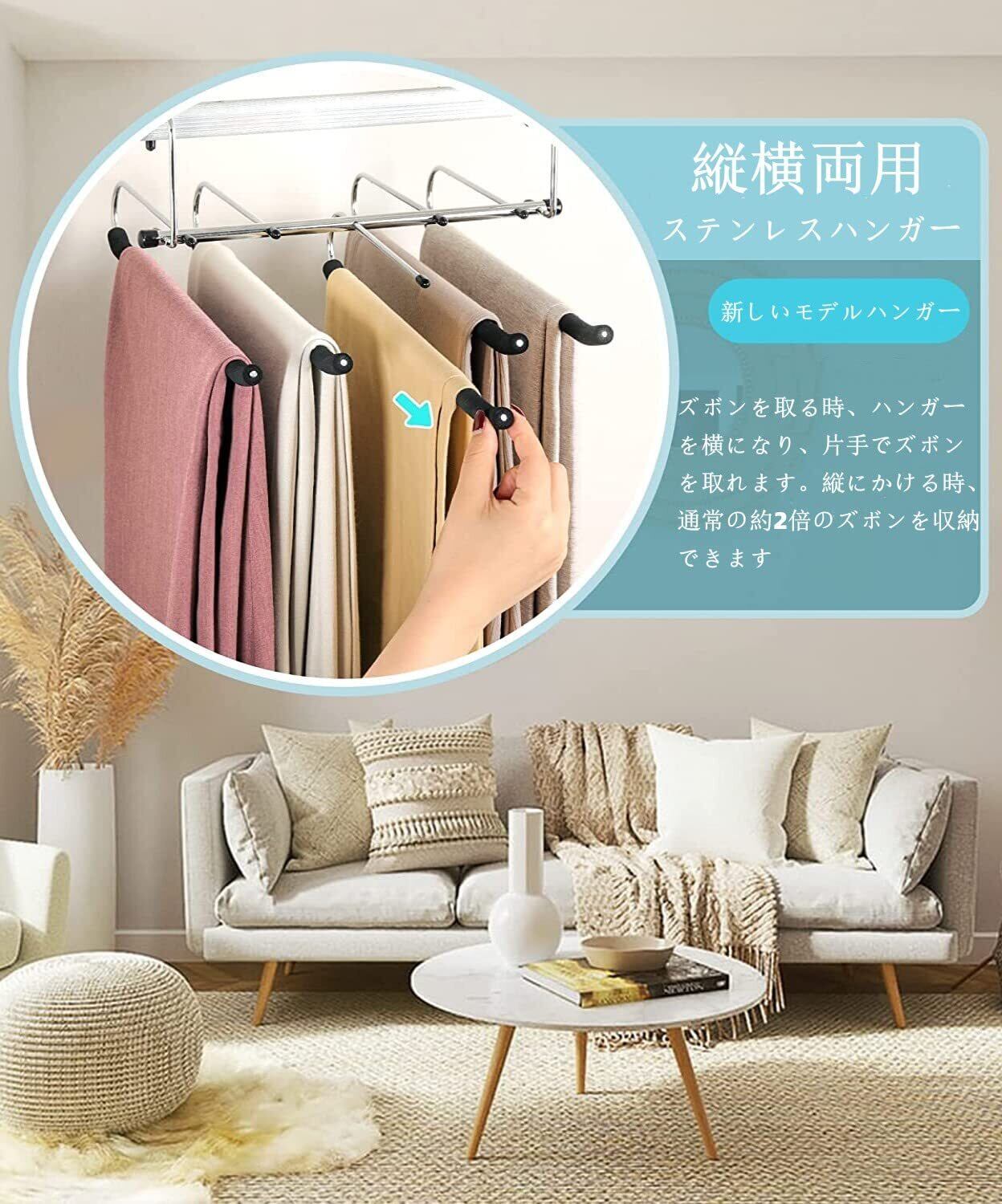 【省スペースハンガー】このハンガーは1枚で 5本のズボンを収納できますが、元のハンガーのスペースしか占有しません。ズボンを掛ける時はハンガーを横置き、操作をより便利に!また、ハンガーを縦に掛けると省スペースになります。押し入れのスペースを有効に活用して、より多くの衣類を収納できます。