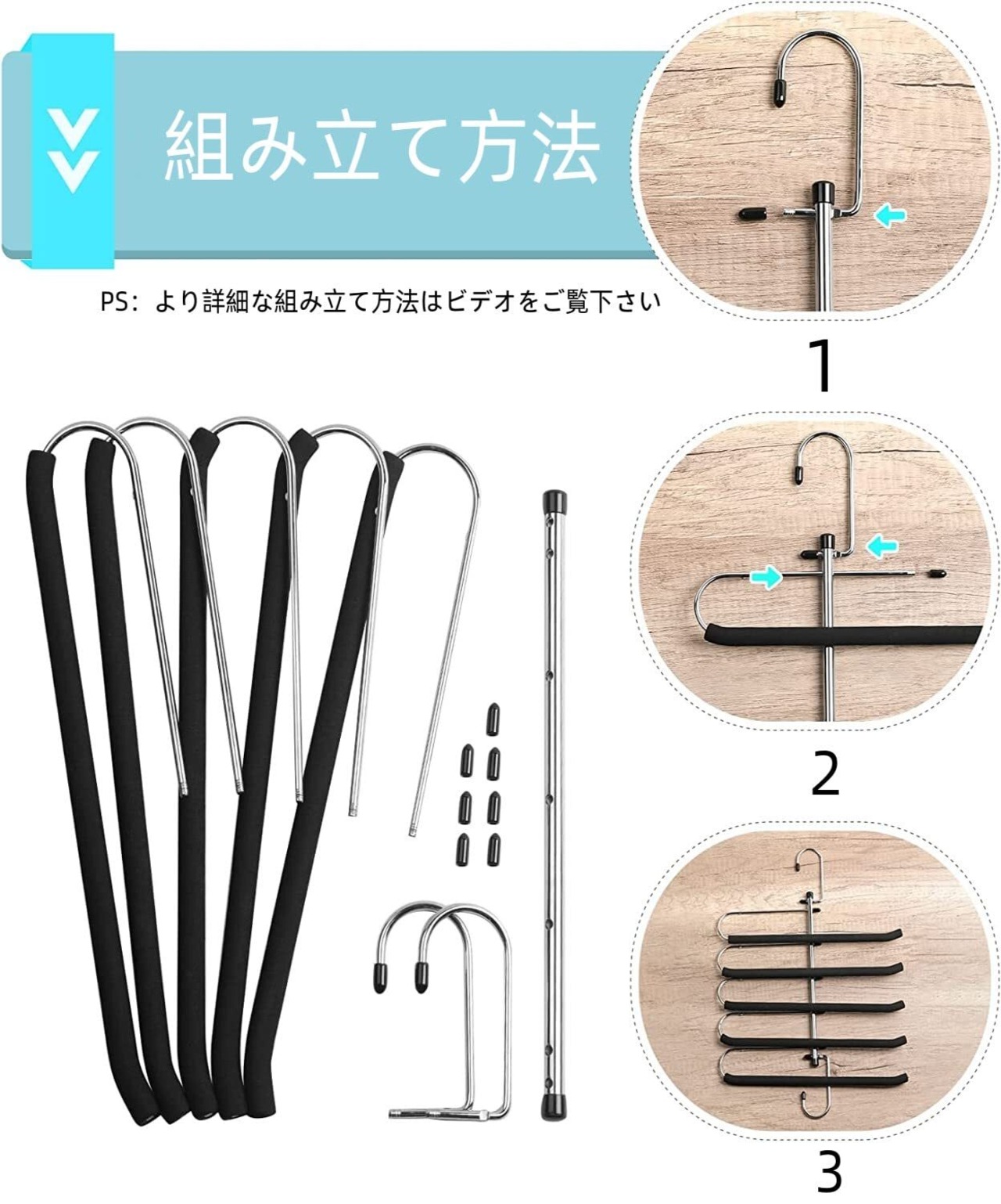 【組み立て簡単】このハンガーは自分で組み立てる必要がありますが、組み立て手順が簡単です。わからない時は組み立て動画や写真を参考してください。 ズボンハンガーを使わない時は分解して箱に戻せ、コンパクトで場所を取れません。