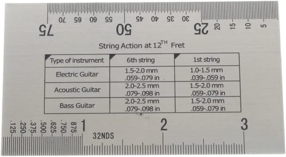 3.12-th 弦の距離はすでにはっきりと刻まれています。読むことができます。標準的なデータを提供します。これらはエレキギター、アコースティックギター、ベースギターを含み、2つのユニットの比較グループが見られます。インチとミリを含みます。