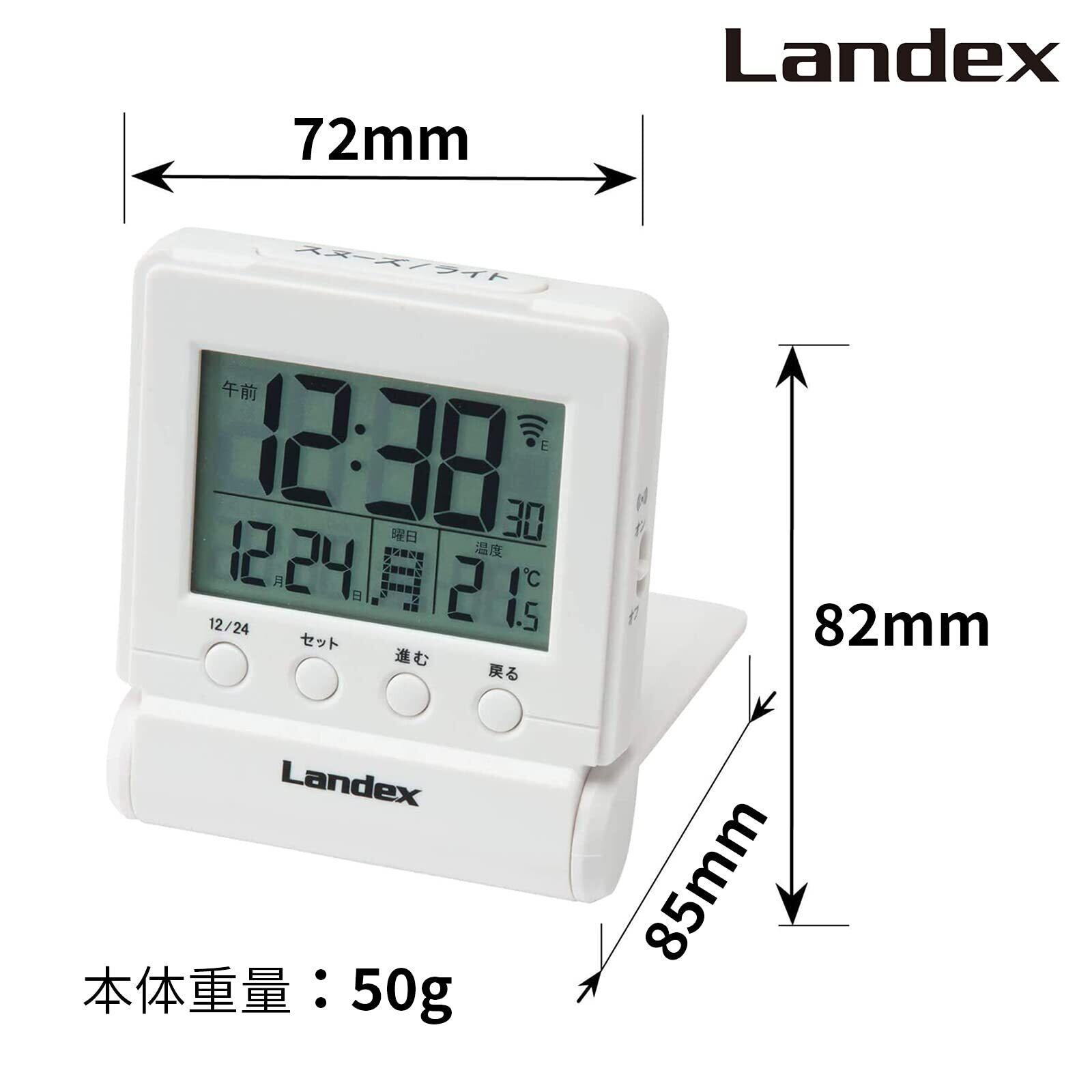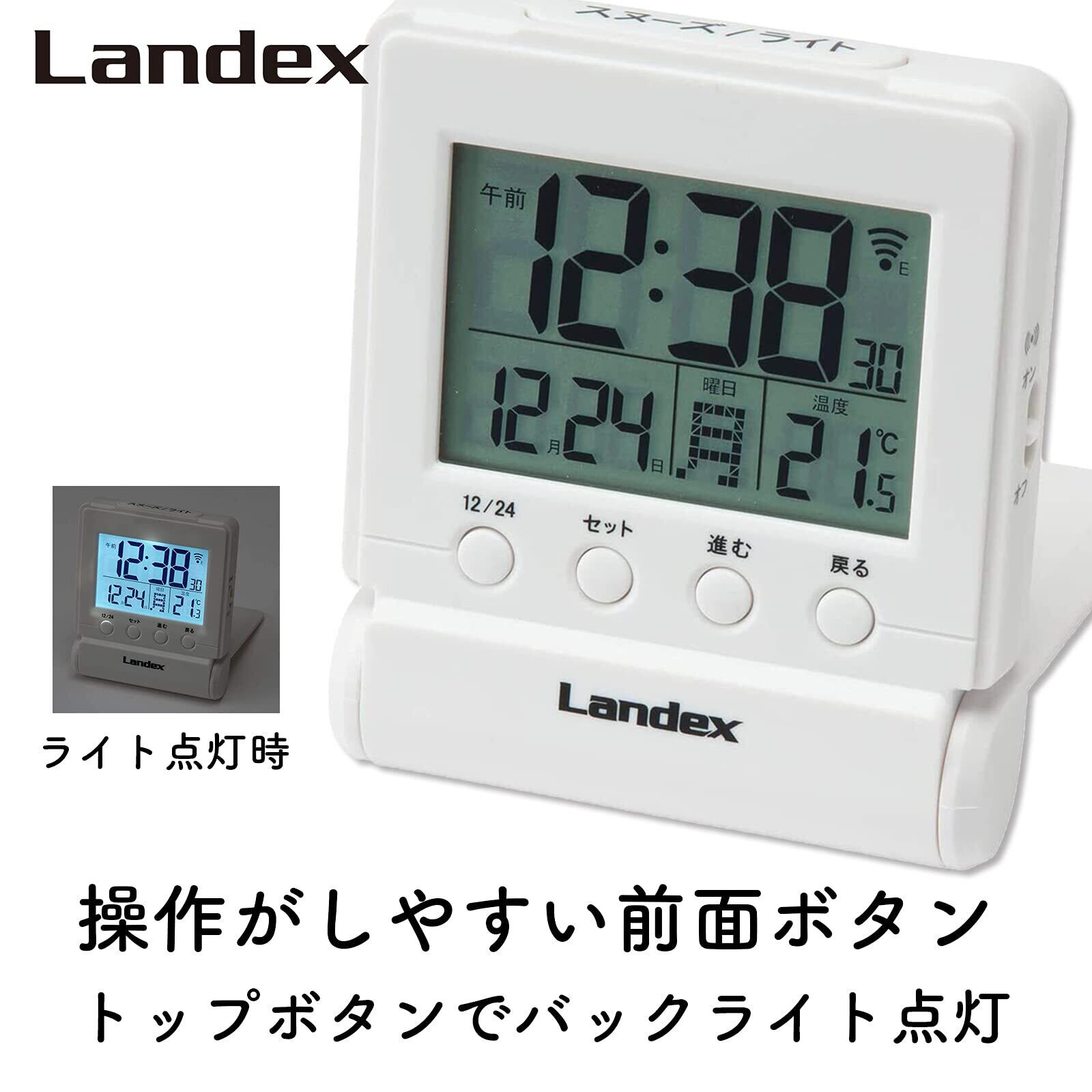 ランデックス(Landex) 目覚まし時計 タイムクリック 電波 デジタル 温度 日付表示 トラベルクロック ホワイト YT5266WH