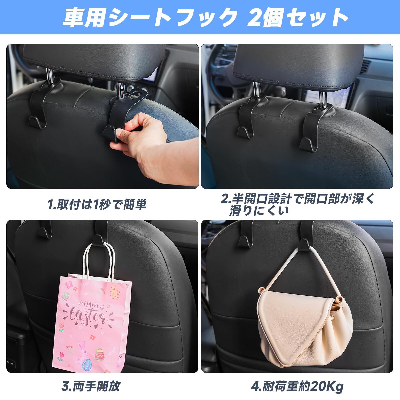 【うれしい2個入り】: 運転席用と助手席の両方に取り付け可能! カーシートフックもついています
