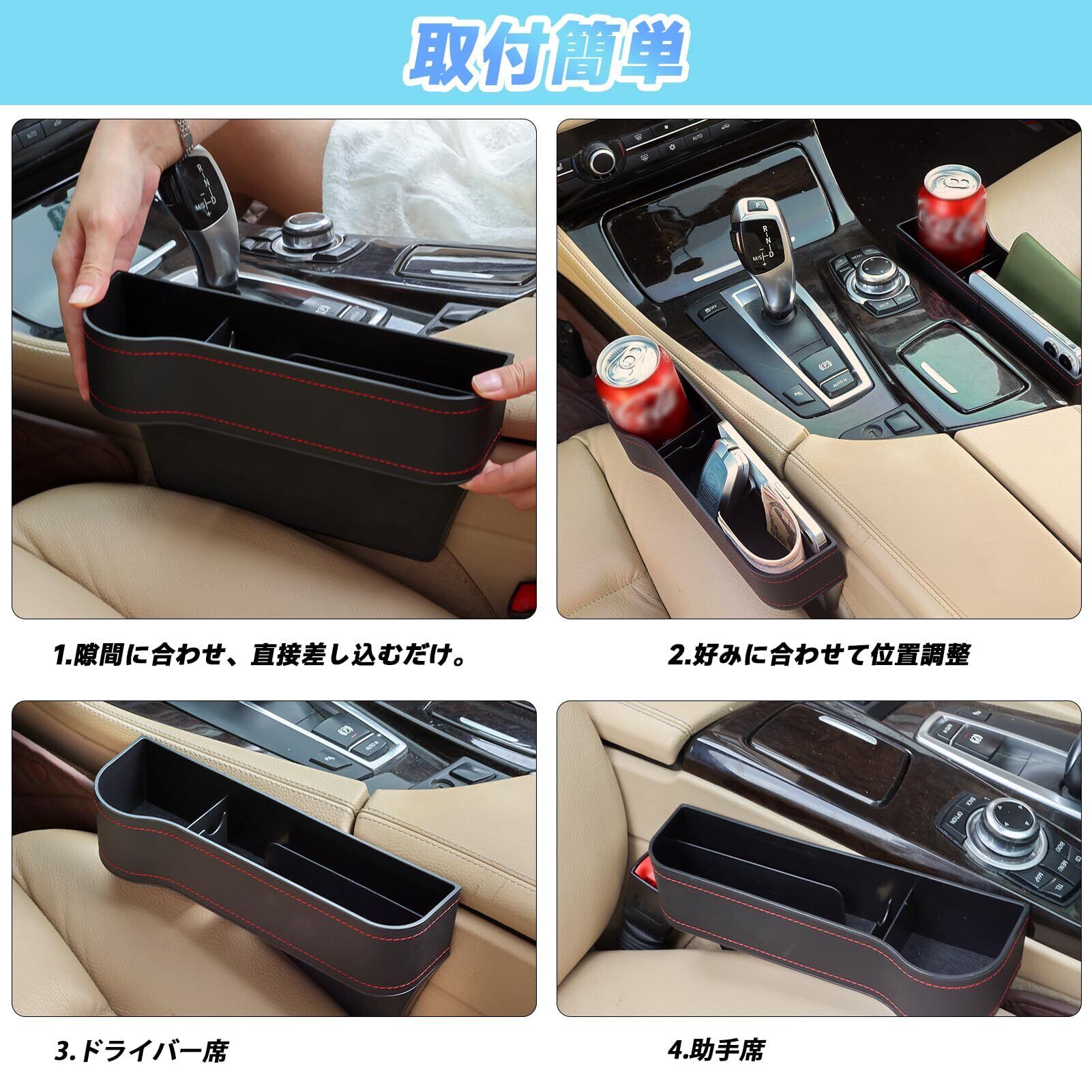 カーシート 隙間収納ボックス 2個入り 運転席 助手席 耐久性 取り付け簡単 大容量 シートポケット サイド 収納 シートサイド スマホ 現金 カード 小物 飲み物 収納 車 ドリンクホルダー (黒)